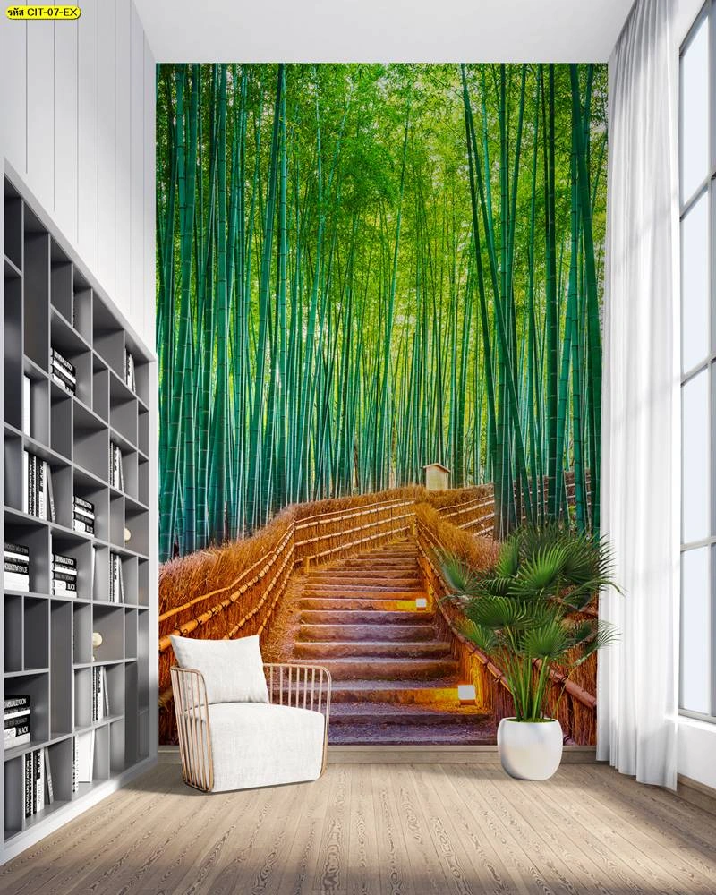 ภาพป่าไผ่สีเขียวเส้นนำสายตาขึ้นเนินบันได ให้ความสดชื่นและลึกมิติ เหมาะโซนอ่านหนังสือ ห้องประชุมครีเอทีฟ และผนังฟีเจอร์เชื่อมธรรมชาติ