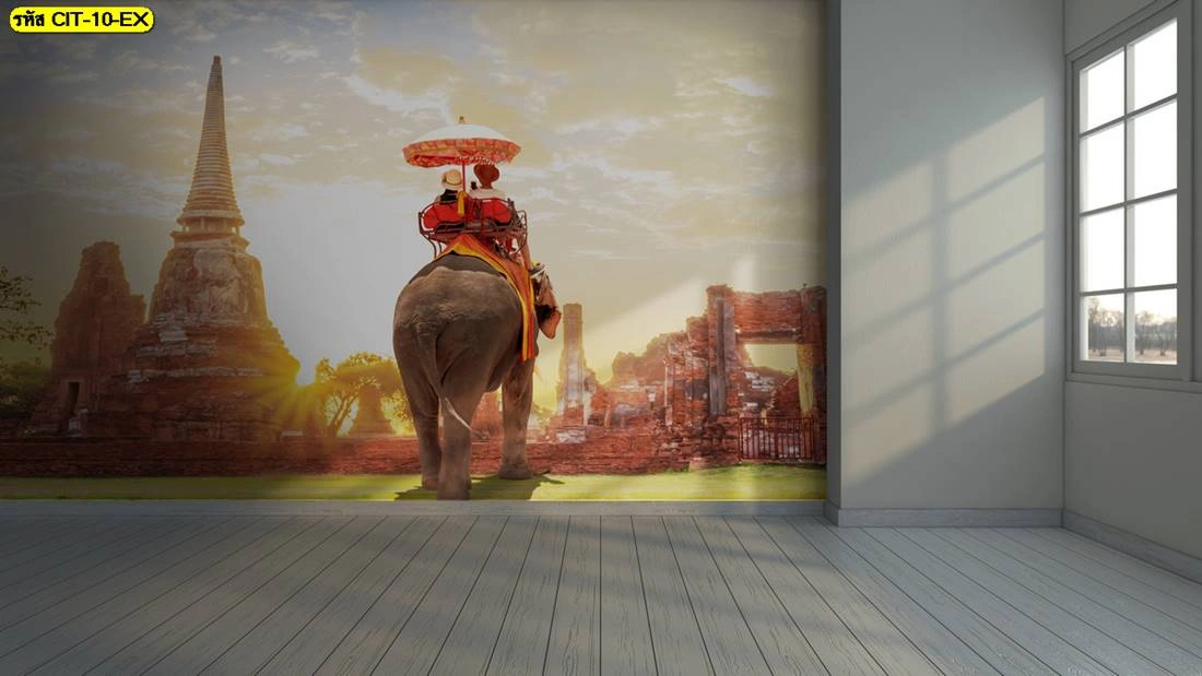 วอลเปเปอร์ภาพวิวเอเชีย ภาพช้างกับแสงเย็นหน้าโบราณสถาน โทนอุ่นเหมาะโถงองค์กร ใช้เป็นฉากเล่าเรื่องวัฒนธรรมบนผ้าแคนวาสไร้รอยต่อผลิตตามขนาด