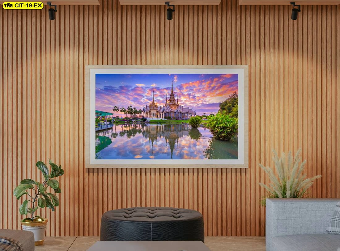 วอลเปเปอร์ภาพวิวเอเชีย ภาพสถาปัตยกรรมริมน้ำท้องฟ้าเฉดชมพูม่วงสะท้อนเงางดงาม ในกรอบแขวนผนังไม้สำหรับโถงองค์กร ช่วยสร้างจุดโฟกัสงานต้อนรับอย่างสง่างาม