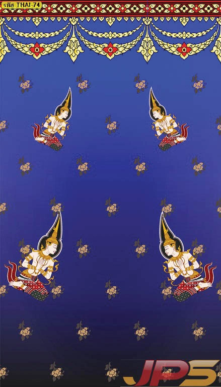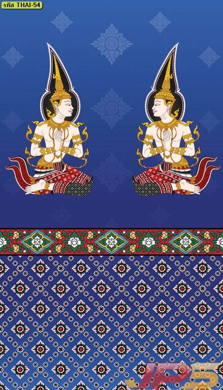 ภาพพิมพ์ลายเทพพนมไทย ลายเทพพนมพนมมือจัดวางห่างกันเล็กน้อย บนพื้นน้ำเงินที่มีลายกนกละเอียด สำหรับการทำสติ๊กเกอร์ติดกระจกห้องพระ