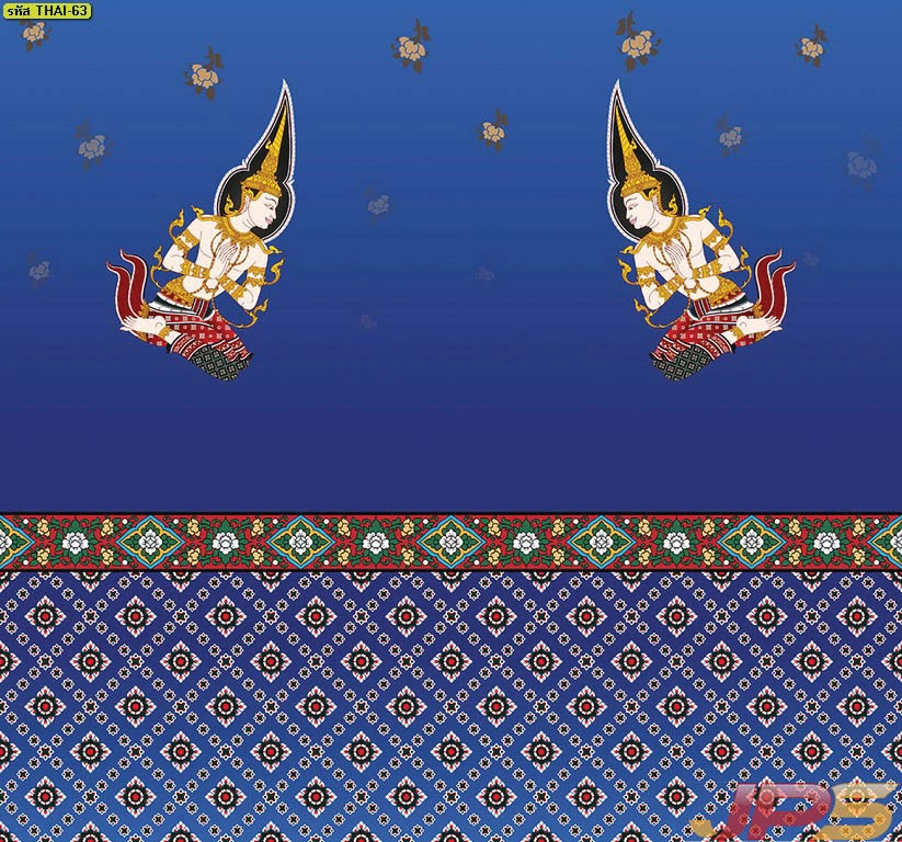 ภาพงานศิลปะไทยลายเทพพนม ลวดลายเทพพนมพนมมือเต็มพื้นที่ งานพิมพ์ลายไทยเกรดพรีเมียมสีน้ำเงิน-ทองสำหรับงานตกแต่งผนัง
