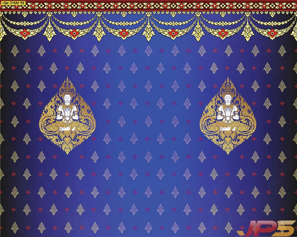 วอลเปเปอร์ลายเทพพนมพื้นน้ำเงินทอง พร้อมดีไซน์พวงมาลัยประดับขอบด้านบนช่วยสร้างกรอบงานศิลปะไทยที่สมบูรณ์แบบ