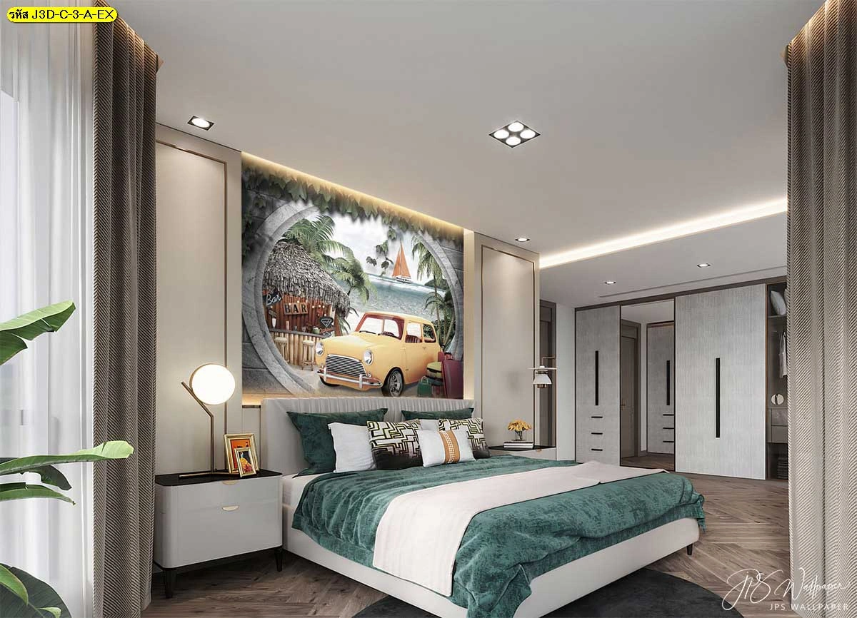 ภาพติดผนังห้องนอนลายรถวินเทจสีเหลืองท่องเที่ยวชายทะเลสามมิติสไตล์ทรอปิคอลรีสอร์ทโทนสีเขียวเทอร์ควอยซ์ตกแต่งห้องนอนสวยหรู