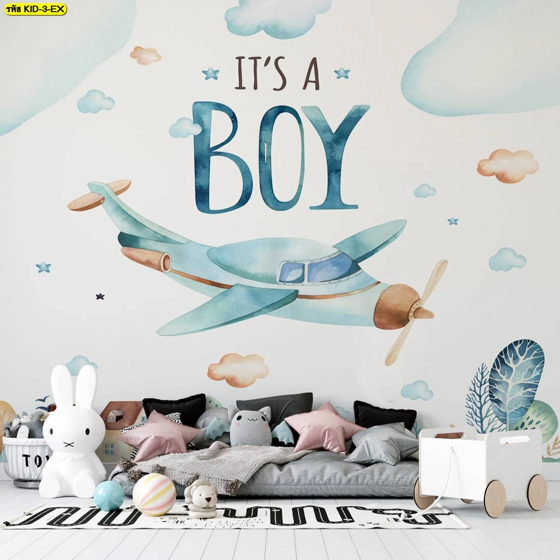 วอลเปเปอร์ห้องเด็กผู้ชาย ลายการ์ตูนสไตล์สแกนดิเนเวียน เป็นภาพติดผนังห้องลูกชายลายเครื่องบินสีพาสเทลที่วาดด้วยเทคนิควอเตอร์คัลเลอร์สวยงามบนพื้นหลังสีครีมอ่อน มีข้อความ “IT’S A BOY” โดดเด่นตรงกลาง ลวดลายประกอบด้วยเครื่องบินขนาดใหญ่สีฟ้าพาสเทลบินอยู่ท่ามกลางเมฆปุยและดาวเล็กๆ สร้างบรรยากาศแห่งการผจญภัยบนท้องฟ้าอันกว้างใหญ่ โทนสีหลักเป็นฟ้าอ่อน ขาวนวล และส้มพาสเทลที่ให้ความรู้สึกอบอุ่นนุ่มนวลเหมาะสำหรับห้องทารกชายหรือเด็กเล็กอายุต่ำกว่า 5 ขวบ วอลเปเปอร์ห้องเด็กสีฟ้าโทนอบอุ่นแบบนี้ช่วยกระตุ้นจินตนาการเกี่ยวกับการบินและการสำรวจโลกกว้าง ส่งเสริมความฝันและความกล้าหาญของเด็กชาย รูปติดผนังห้องเด็กลายการ์ตูนสัตว์โทนสีนุ่มนวลแบบนี้สามารถจับคู่กับเฟอร์นิเจอร์สีขาวหรือไม้อ่อนสไตล์สแกนดิเนเวียนเพื่อสร้างความกลมกลืนและดูทันสมัย วอลเปเปอร์ผ้าแคนวาสสั่งทำห้องลูกชายไร้รอยต่อ สามารถใส่ชื่อลูกหรือข้อความพิเศษแทน “IT’S A BOY” ได้ตามต้องการ