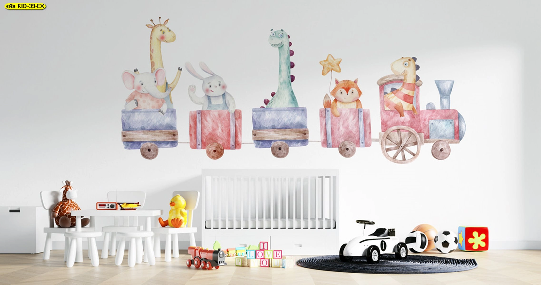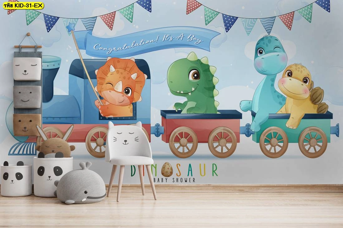 ห้องเด็กธีมไดโนเสาร์ขี่รถไฟสไตล์การ์ตูน