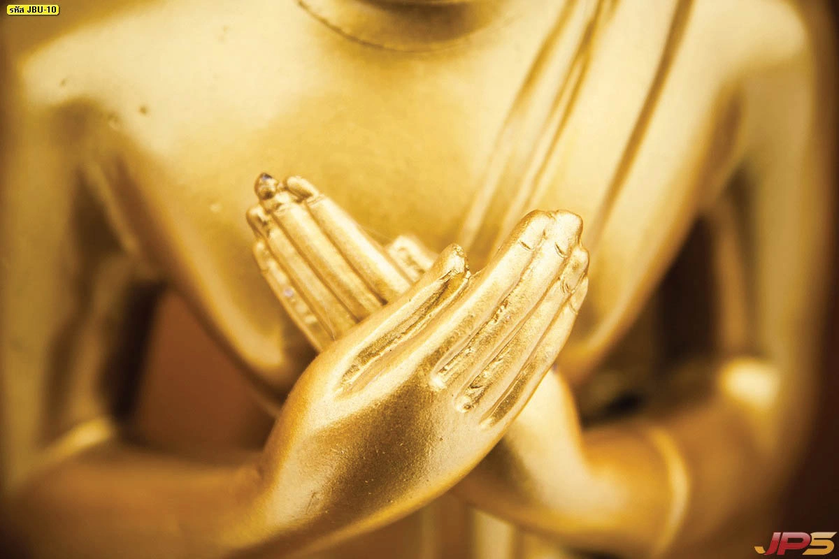 ภาพพระพุทธรูปท่าพนมมือ โทนสีทองอ่อน สื่อถึงความศรัทธา เหมาะสำหรับติดผนังห้องพระเพื่อเสริมความเป็นสิริมงคล