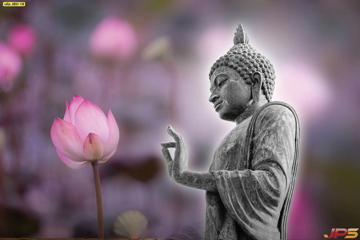 ภาพพระพุทธรูปคู่ดอกบัวสีชมพู ฉากหลังเบลอ เพิ่มความนุ่มนวล เหมาะกับการตกแต่งห้องพระให้รู้สึกผ่อนคลาย