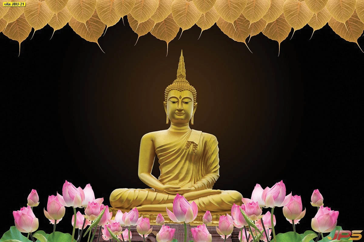 วอลเปเปอร์พระพุทธรูปสีทองล้อมด้วยดอกบัวและใบโพธิ์ สื่อถึงความสงบและความเจริญรุ่งเรือง เหมาะสำหรับห้องพระ