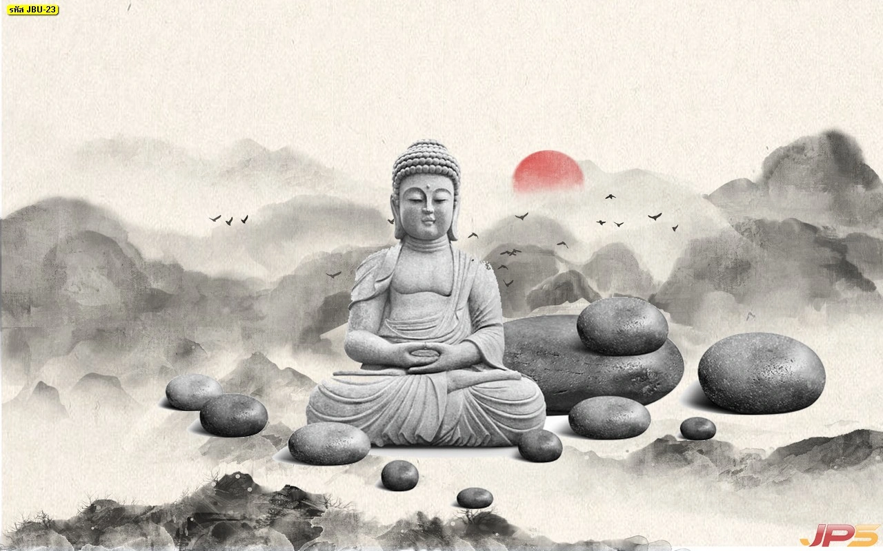 วอลเปเปอร์พระพุทธรูปสไตล์มินิมอลโทนขาวเทา มีภูเขาและหิน เพิ่มความสงบ เรียบง่าย เหมาะกับห้องพระยุคใหม่