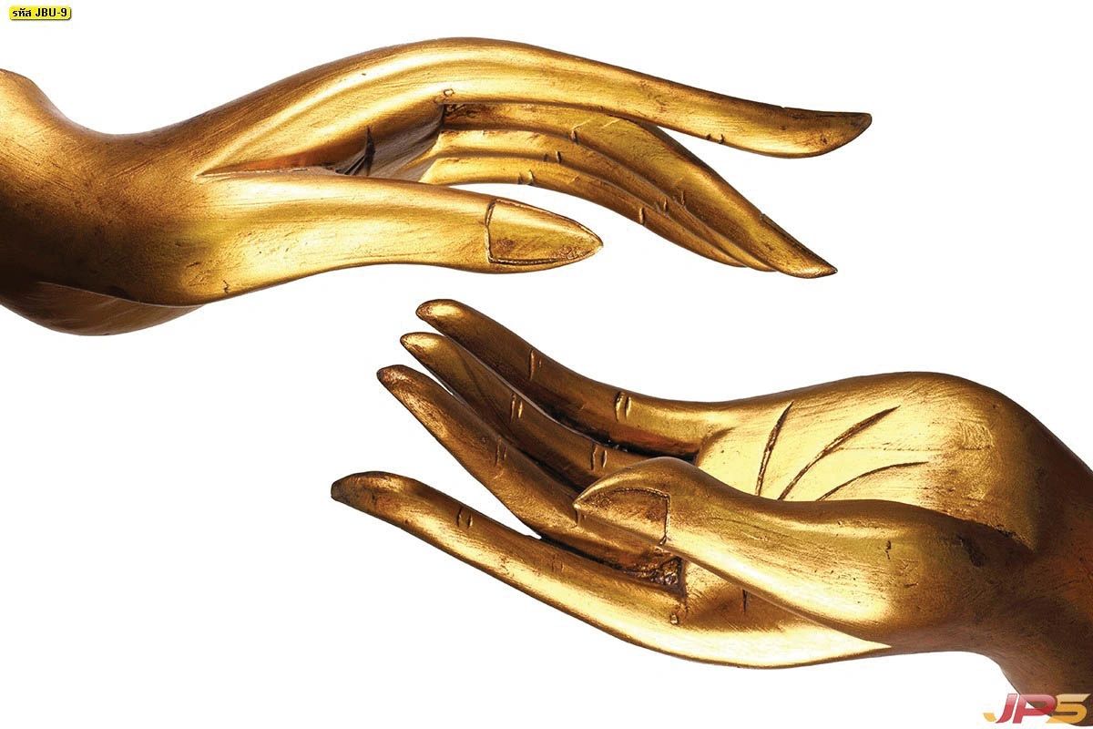 ภาพศิลปะไทยมือพระพุทธรูปสีทองบนพื้นหลังเรียบ สื่อถึงความเมตตาและความสงบ เหมาะใช้เป็นภาพติดผนังห้องพระสไตล์มินิมอล
