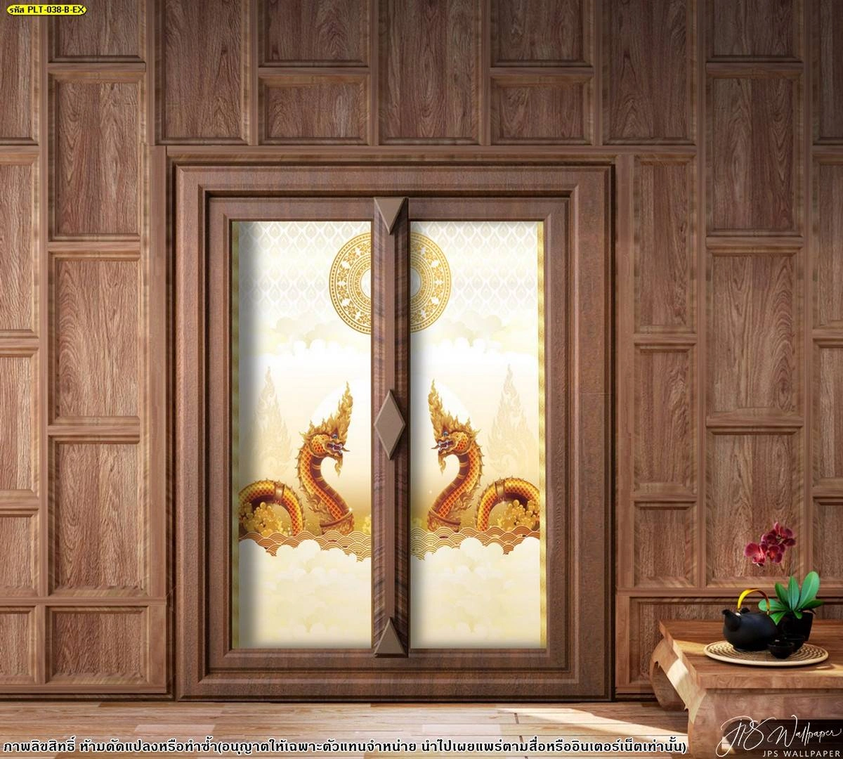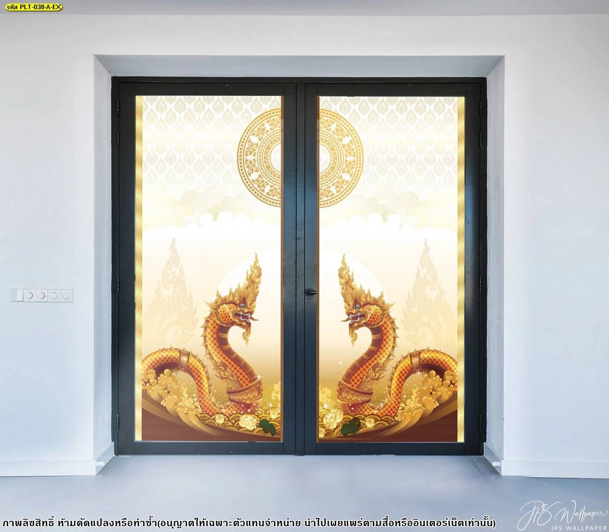 สติ๊กเกอร์ติดกระจกห้องพระ ลายไทยพญานาคสีทองบนพื้นหลังสีขาวเหลือง ตกแต่งผนังลายไม้ให้ดูหรูหราสง่างามและดูน่าเลื่อมใส