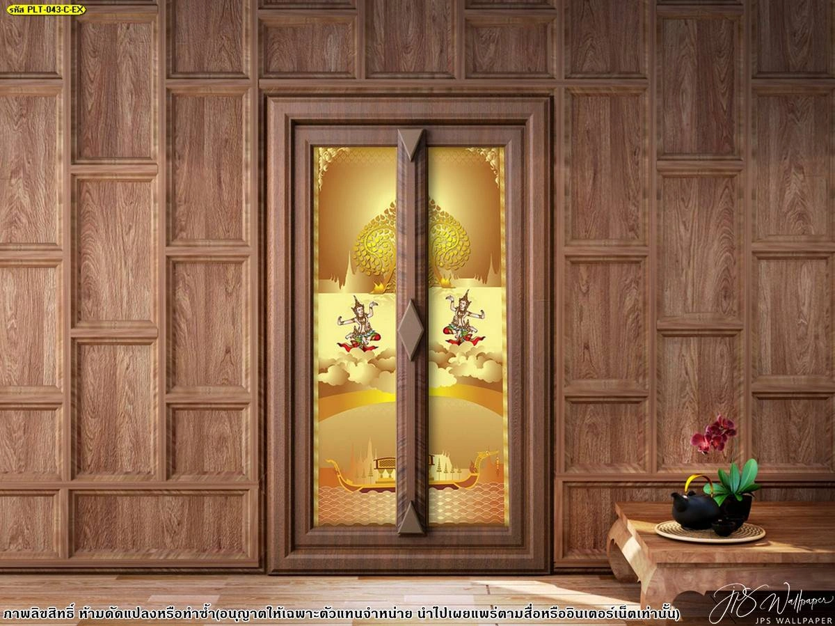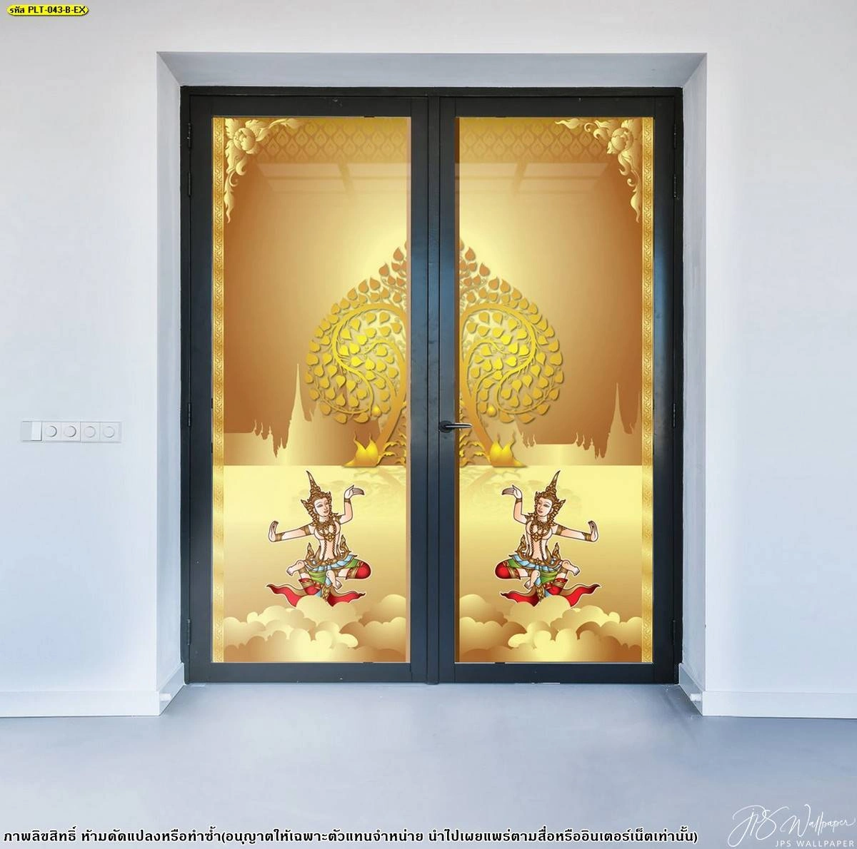 สติ๊กเกอร์ติดกระจกห้องพระ ลายไทยเทพพนมบนพื้นหลังสีเขียว ติดตั้งบนบานประตูทรงโค้ง ช่วยยกระดับงานสถาปัตยกรรมให้ดูงดงาม