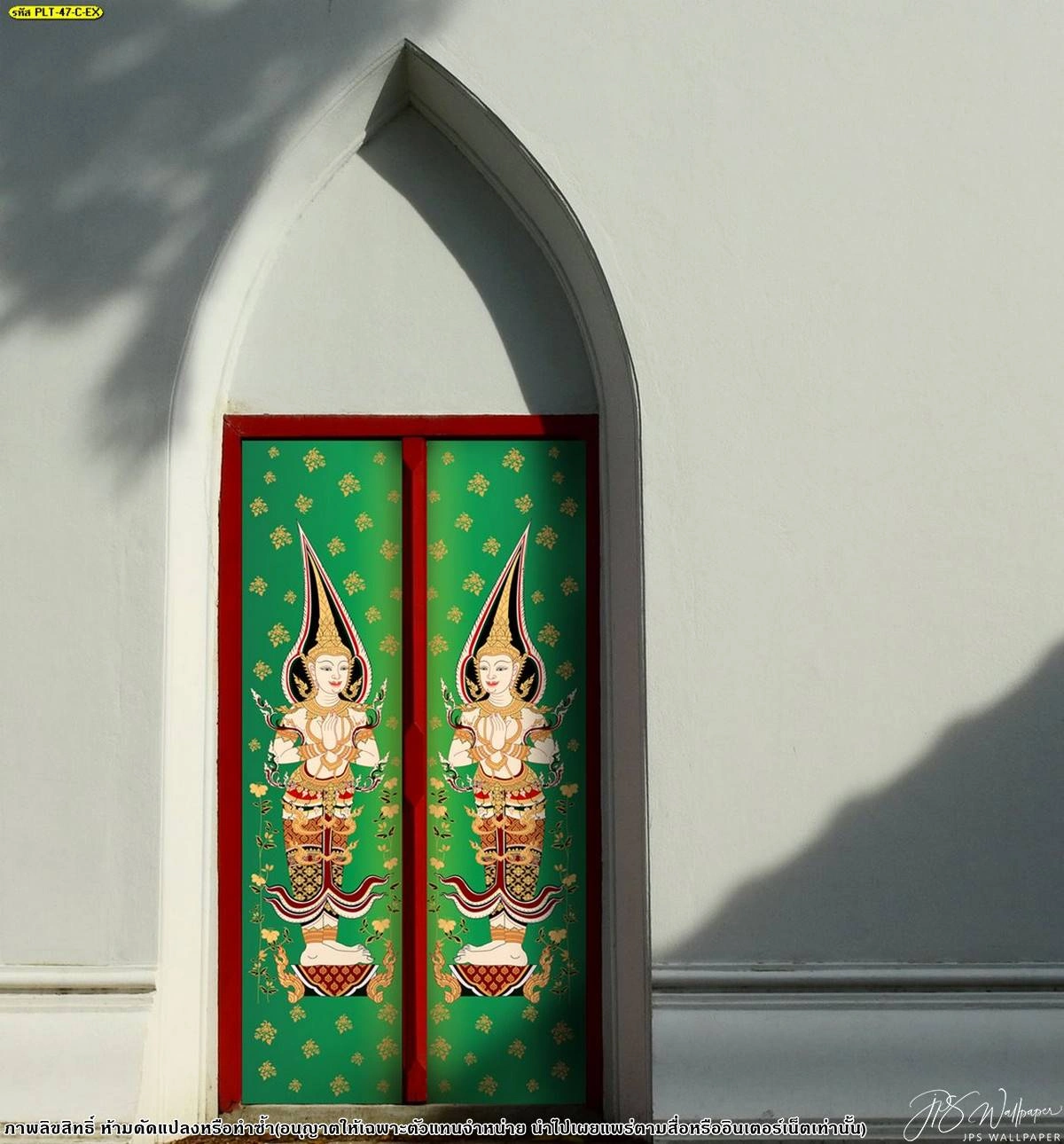 ภาพลายไทยพื้นหลังสีเขียวเหนี่ยวทรัพย์ เสริมมงคลลายเทพพนมยืนพนมมือบนพื้นสีเขียวไล่เฉด ตกแต่งประตูห้องพระให้สวยสะดุดตา