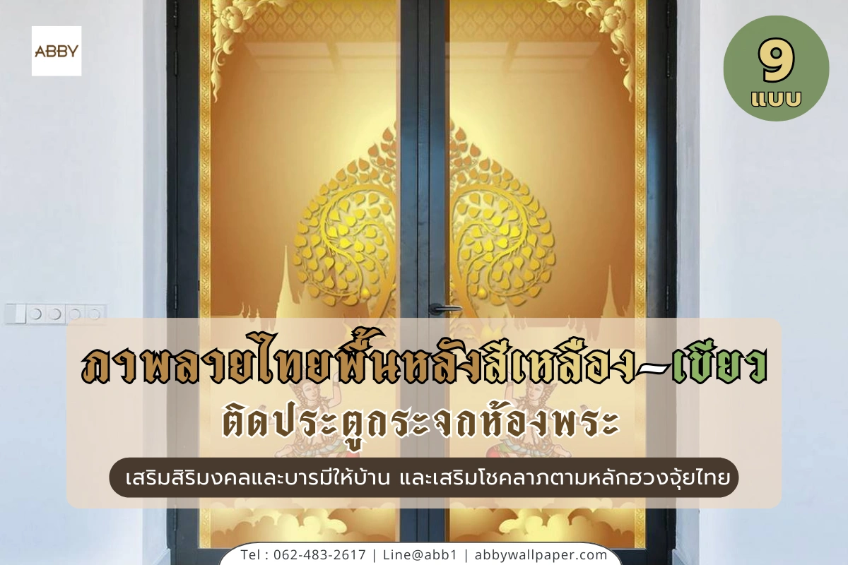ภาพติดกระจกห้องพระพื้นหลังสีเหลืองเขียว สติ๊กเกอร์ 3M ลายไทย ติดกระจกวัดและห้องพระ