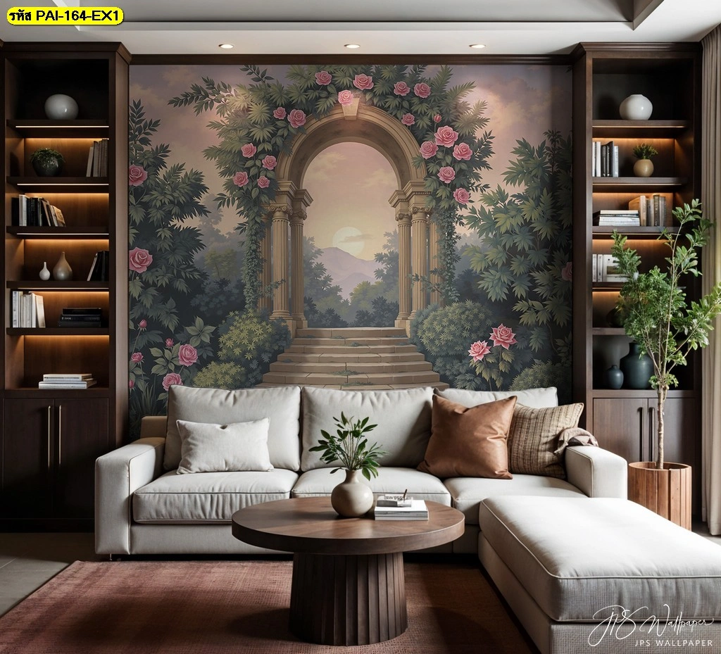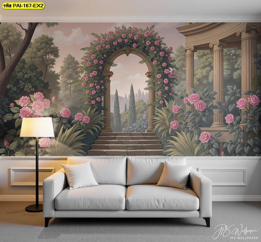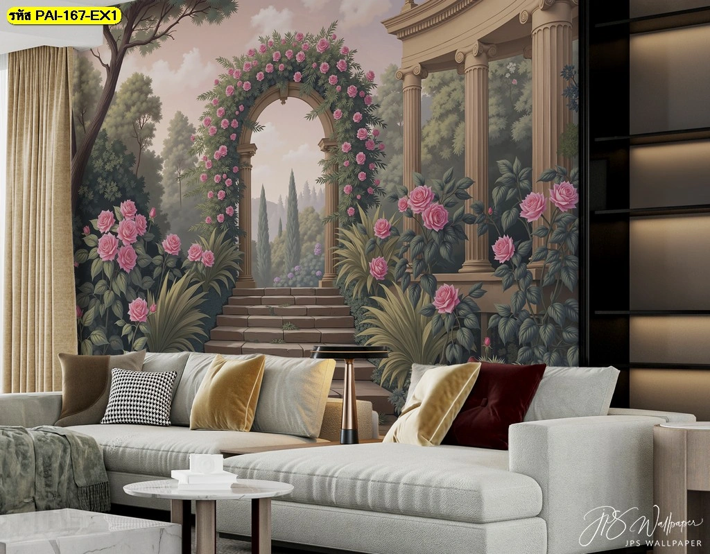 - วอลเปเปอร์โค้งซุ้มเสาโรมัน ดอกกุหลาบเถาเลื้อย สะท้อนบรรยากาศคลาสสิกและสงบ หรูแต่ไม่แข็งเกินไป