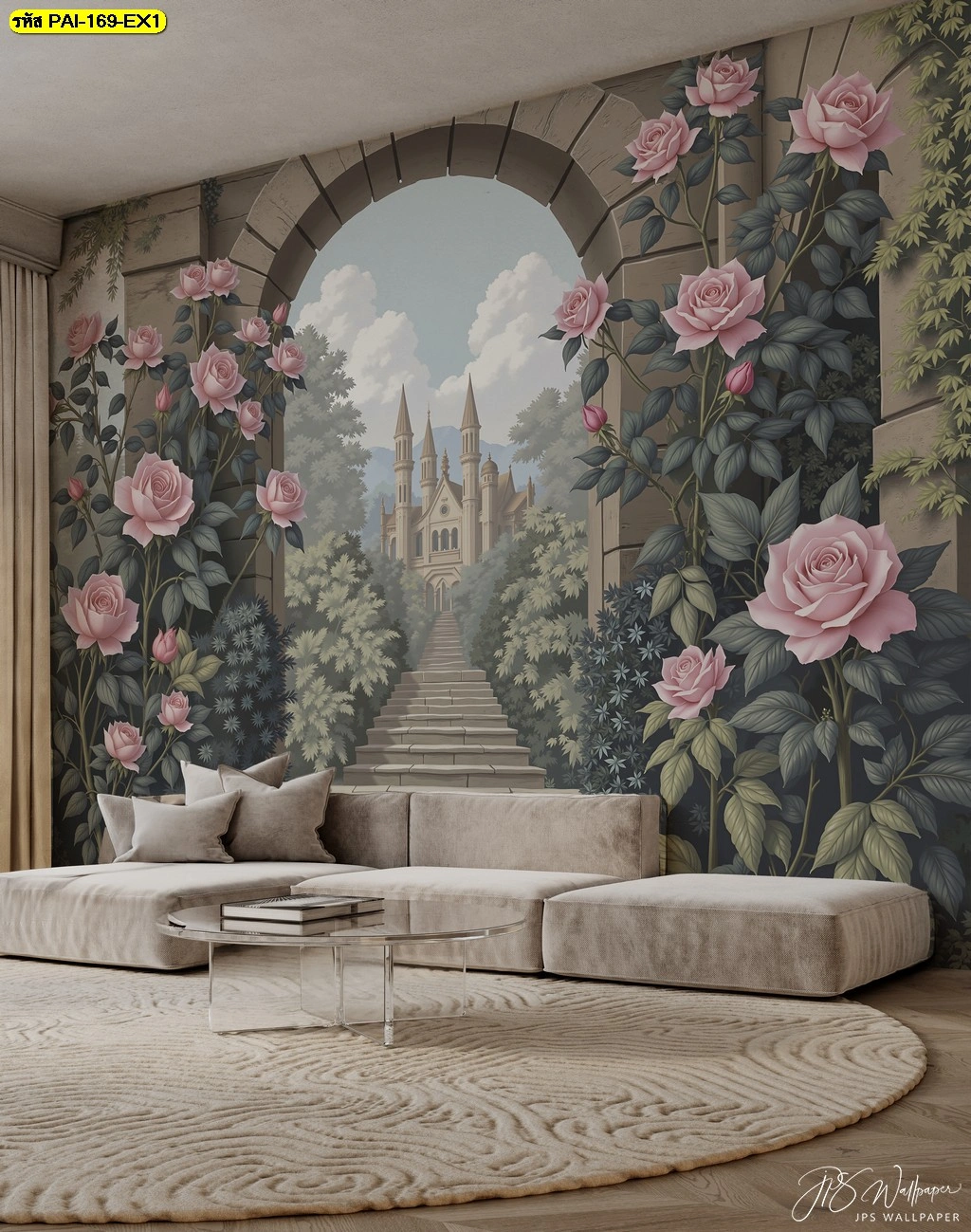 วอลเปเปอร์ยุโรปแฟนตาซี ออกแบบซุ้มโค้งคู่เน้นดอกกุหลาบและพุ่มใบเข้ม เปิดมุมมองไปสู่ปราสาทกลางหุบเขา ช่วยเนรมิตบรรยากาศคลาสสิกให้ห้องรับแขกเพิ่มแรงบันดาลใจ