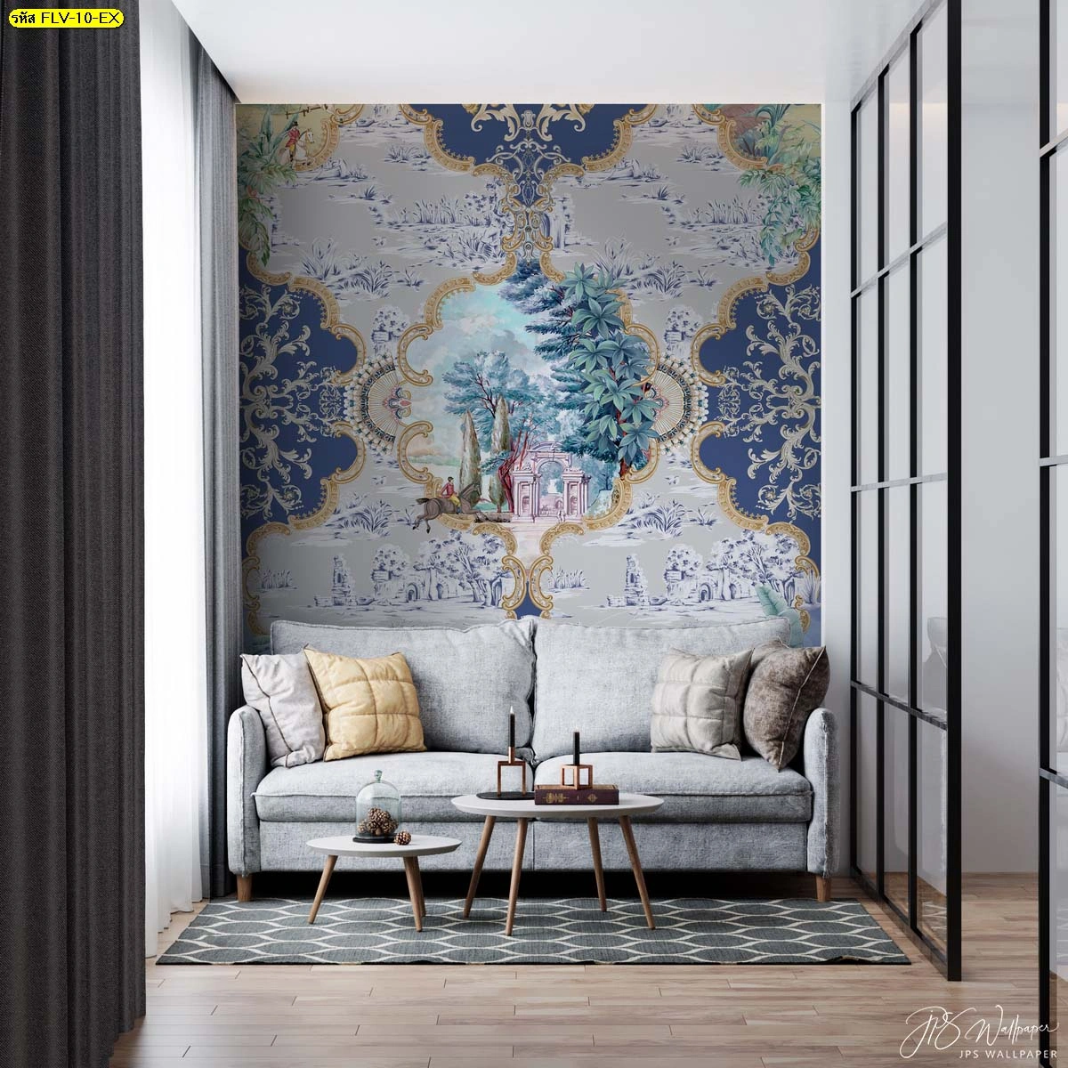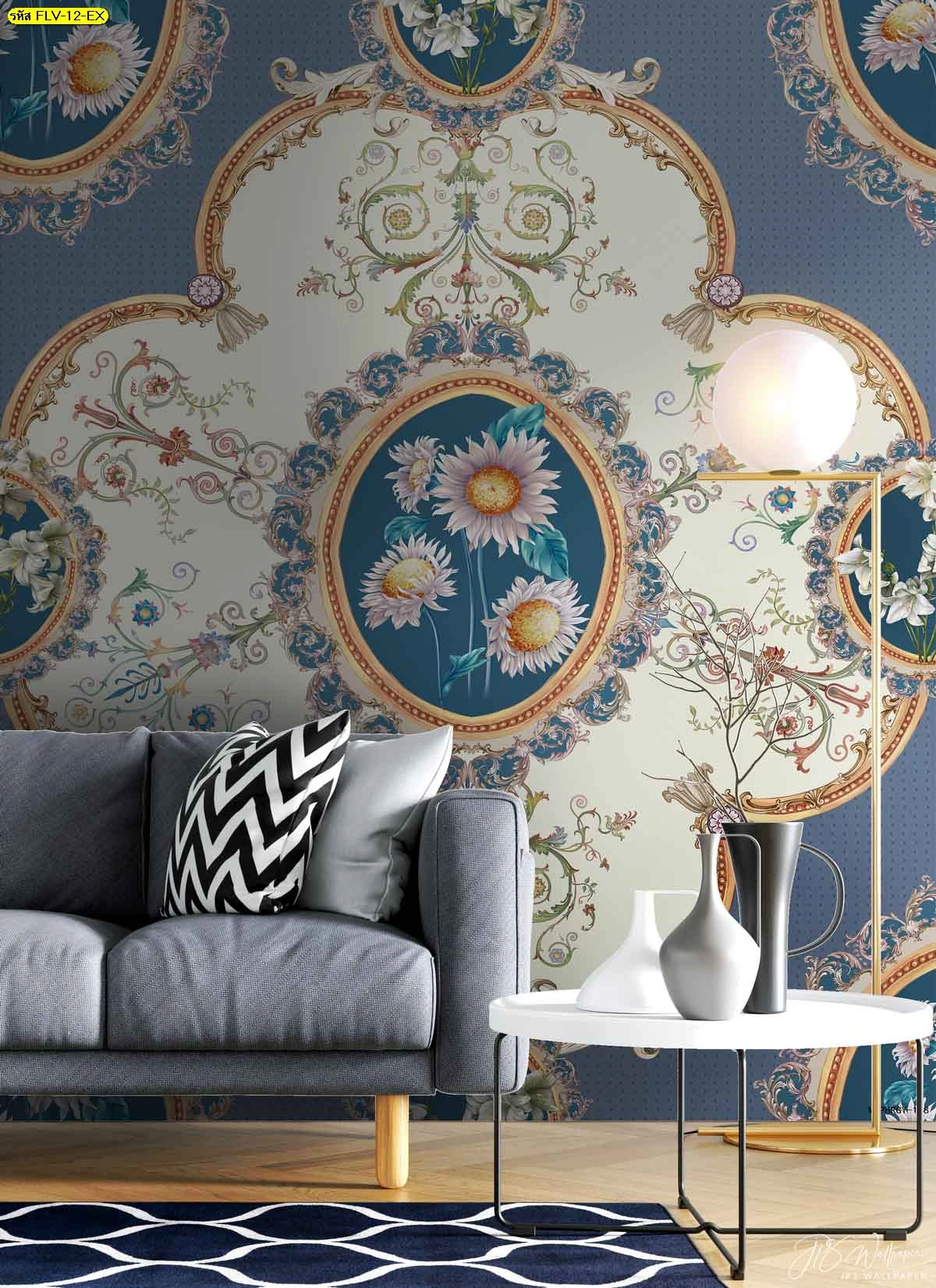 หากคุณกำลังมองหาไอเดียการตกแต่งภายในที่ช่วยยกระดับความหรูหราให้กับสถานที่ ไม่ว่าจะเป็นห้องนั่งเล่นในคอนโดมิเนียม คฤหาสน์ส่วนตัว หรือล็อบบี้โรงแรม การเลือกใช้ วอลเปเปอร์ภาพดอกไม้กรอบคลาสสิก เป็นทางเลือกที่ตอบโจทย์ที่สุด ด้วยเอกลักษณ์ของลวดลายที่สะท้อนความงดงามตามแบบฉบับศิลปะตะวันตก ช่วยเปลี่ยนผนังที่ว่างเปล่าให้กลายเป็นแกลเลอรีศิลปะส่วนตัว ดังตัวอย่างภาพแรก ที่แสดงถึงความวิจิตรของลวดลายสไตล์ Toile de Jouy สีน้ำเงิน ตัดกับเฟอร์นิเจอร์โมเดิร์นได้อย่างลงตัว หรือจะเป็นความอ่อนช้อยของดอกทานตะวันในกรอบวงรีอย่างภาพที่สอง ที่ช่วยเติมความสดชื่นและสง่างามให้กับมุมพักผ่อน