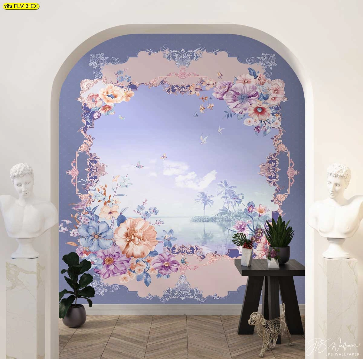 วอลเปเปอร์ภาพวิวทะเลผ่านซุ้มประตูดอกไม้สีม่วงพาสเทล วอลเปเปอร์ภาพดอกไม้กรอบคลาสสิก เพิ่มมิติความลึกให้ห้อง