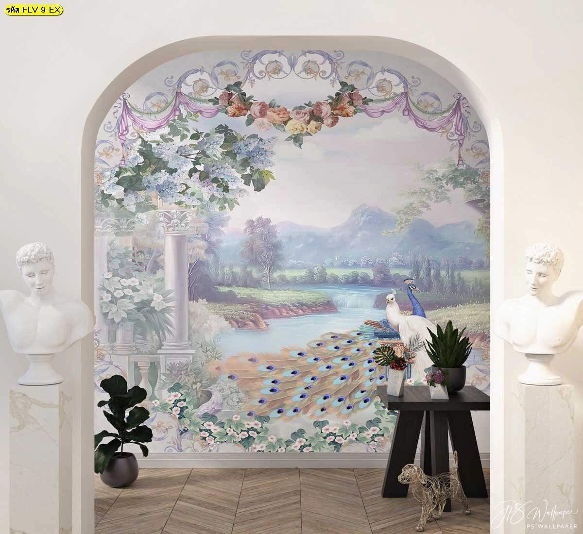 ภาพติดผนังขนาดใหญ่ลายนกยูงในสวนดอกไม้ วอลเปเปอร์ภาพวิวกรอบซุ้มโค้งยุโรป เสริมฮวงจุ้ยและความสวยงามให้มุมห้อง