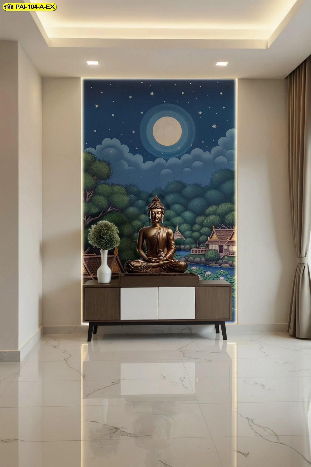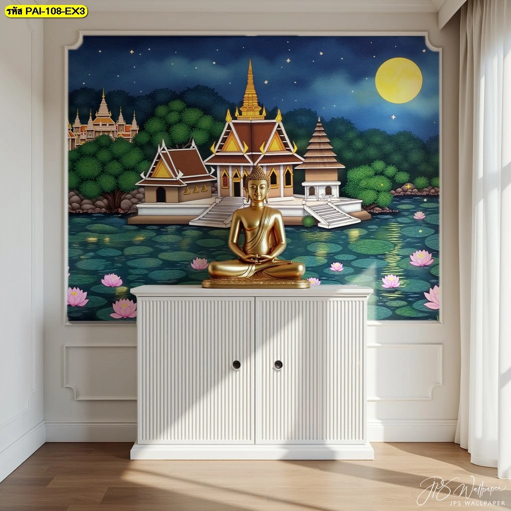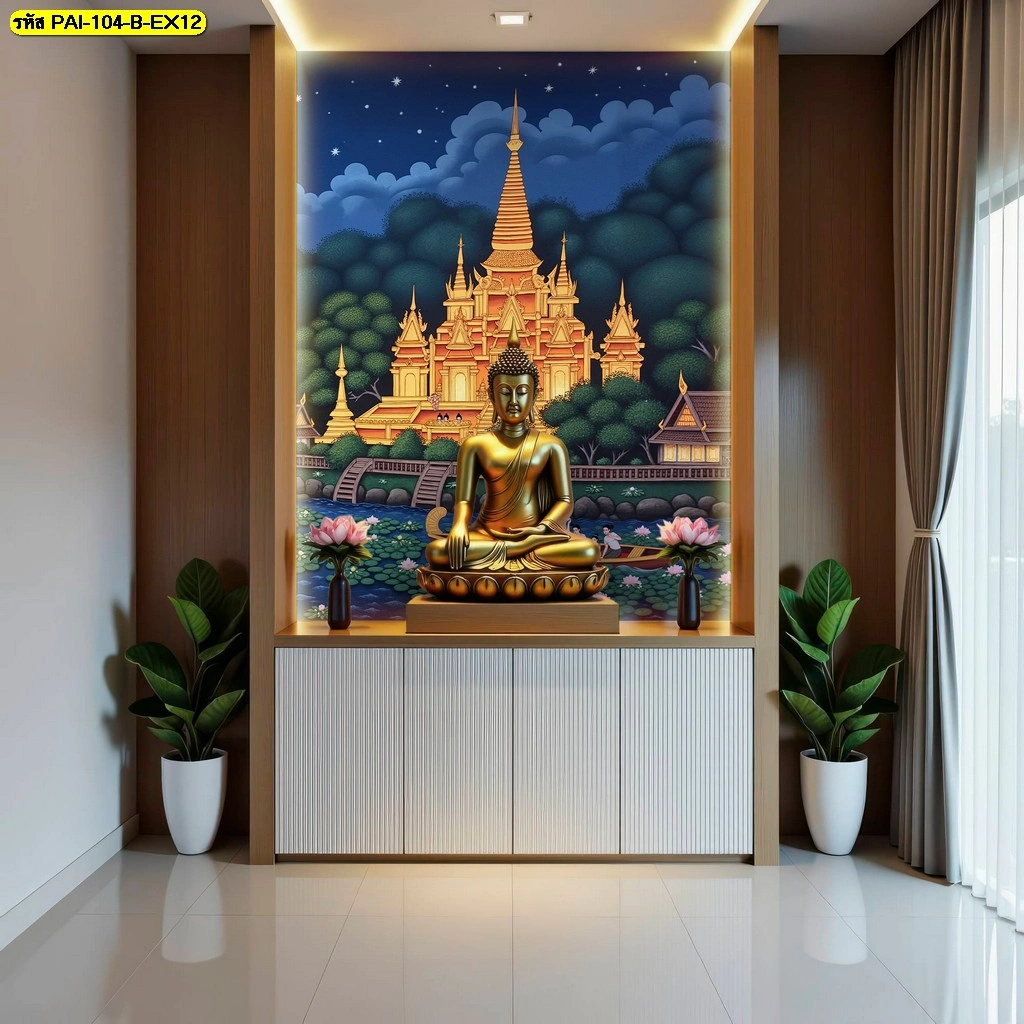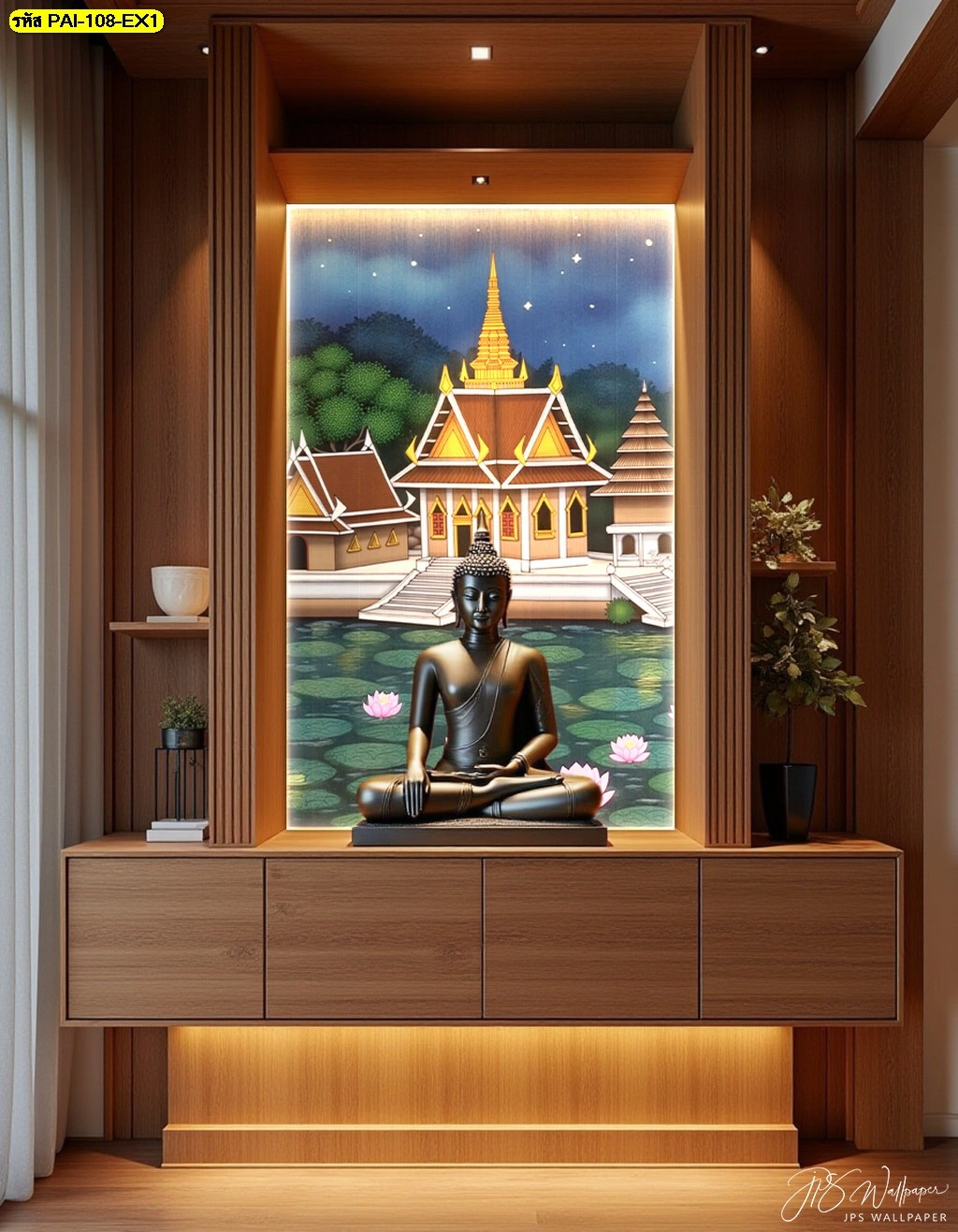 วอลเปเปอร์ภาพวัดริมน้ำใต้แสงจันทร์ติดตั้งในซุ้มไม้บิวท์อินสีน้ำตาลเข้มช่วยเสริมความสง่างามให้กับองค์พระพุทธรูปสีทอง