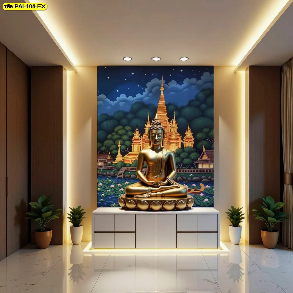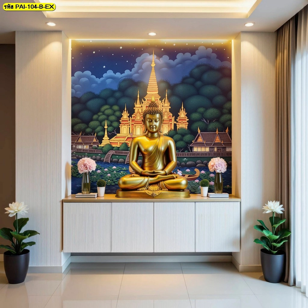 ภาพพุทธศิลป์วอลเปเปอร์ลายไทยร่วมสมัยดีไซน์สีทองอร่ามตัดกับพื้นหลังหมู่บ้านไทยและสระบัวสร้างบรรยากาศมงคลในห้องพระสมัยใหม่