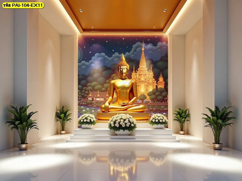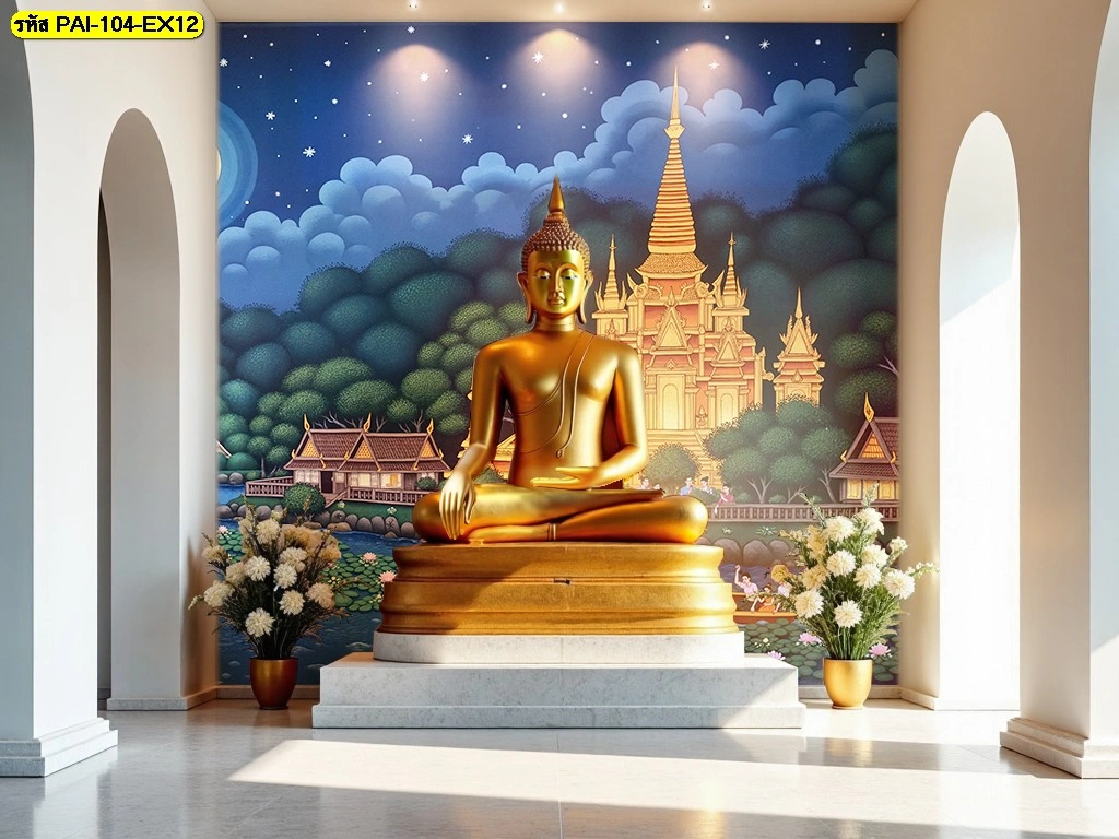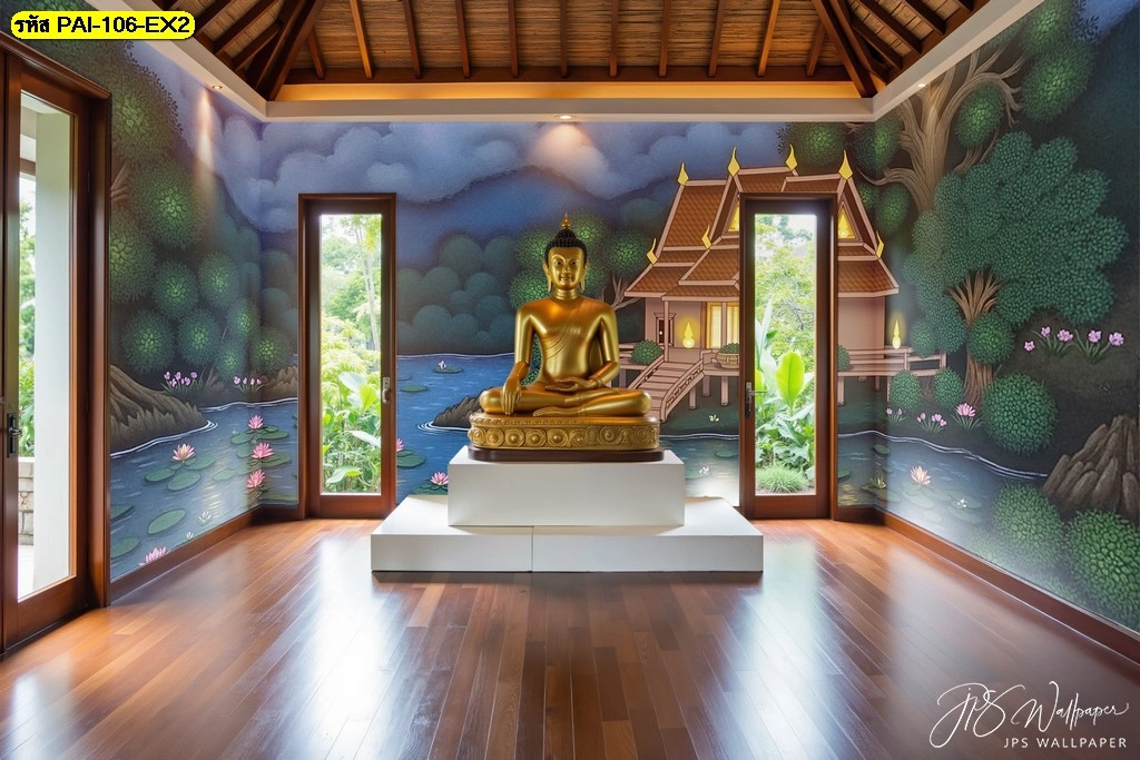 งานพิมพ์วอลเปเปอร์ลายไทยร่วมสมัยขนาดใหญ่พิเศษถ่ายทอดความงดงามขององค์พระประธานสีทองท่ามกลางแมกไม้ในห้องโถงปฏิบัติธรรมที่กว้างขวาง