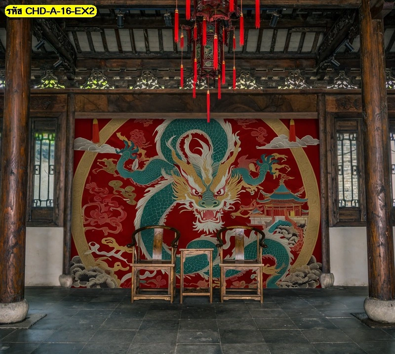 การตกแต่งโถงทางเดินสไตล์จีนโบราณด้วยภาพติดผนังลายมังกรขนาดใหญ่บนพื้นแดง เข้าชุดกับเก้าอี้ไม้แกะสลัก สร้างบรรยากาศที่ดูขลังและศักดิ์สิทธิ์