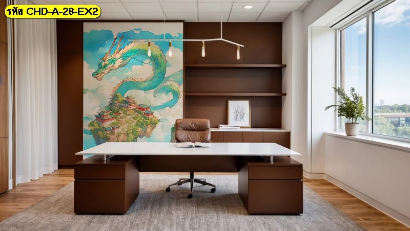 ห้องทำงานผู้บริหารตกแต่งด้วยวอลเปเปอร์ลายมังกรจักรพรรดิสีเขียวบนพื้นแดง ล้อมรอบด้วยลวดลายมงคล เสริมอำนาจบารมีและความน่าเชื่อถือ