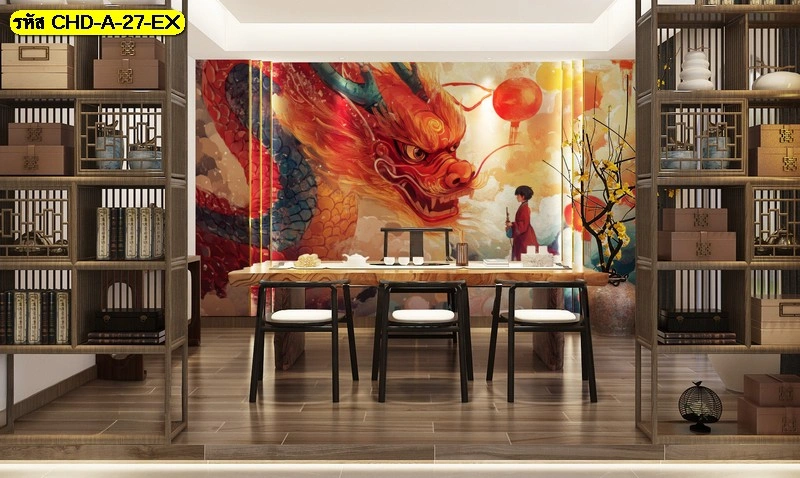 วอลเปเปอร์ภาพมังกรจีนเสริมฮวงจุ้ย สีแดงทองสดใสในห้องทานอาหารไม้สไตล์เซน ช่วยกระตุ้นพลังงานบวกและความมั่งคั่งให้สมาชิกทุกคนภายในบ้าน