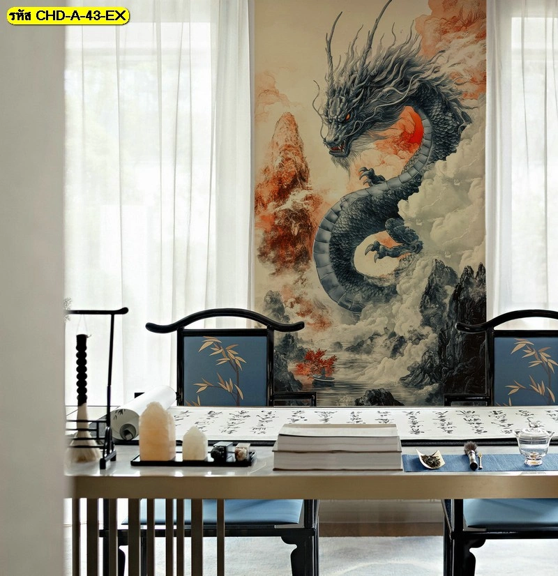วอลเปเปอร์ศิลปะลายมังกร ทรงแนวตั้งประดับห้องเขียนพู่กันจีน ช่วยเน้นความสง่างามและความเป็นสิริมงคลตามหลักฮวงจุ้ยสากลอย่างสมบูรณ์แบบ