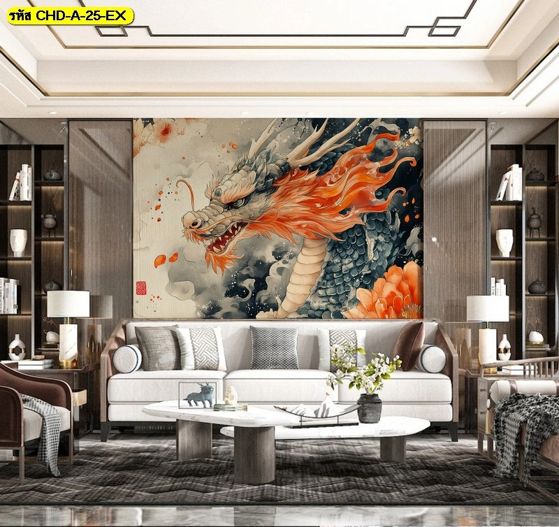 วอลเปเปอร์ลายมังกรเสริมโชคสีสันสดใสตกแต่งผนังหลังโซฟาในห้องนั่งเล่นหรูช่วยเพิ่มพลังบวกและบรรยากาศที่เป็นสิริมงคลภายในบ้าน