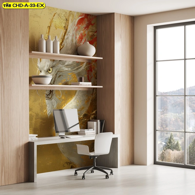 ตกแต่งมุมทำงานส่วนตัวด้วยวอลเปเปอร์มังกรทองสไตล์ Modern Chinese สีทองอร่ามบนพื้นผิวที่มีเท็กซ์เจอร์ช่วยสร้างแรงบันาลใจในการทำงาน