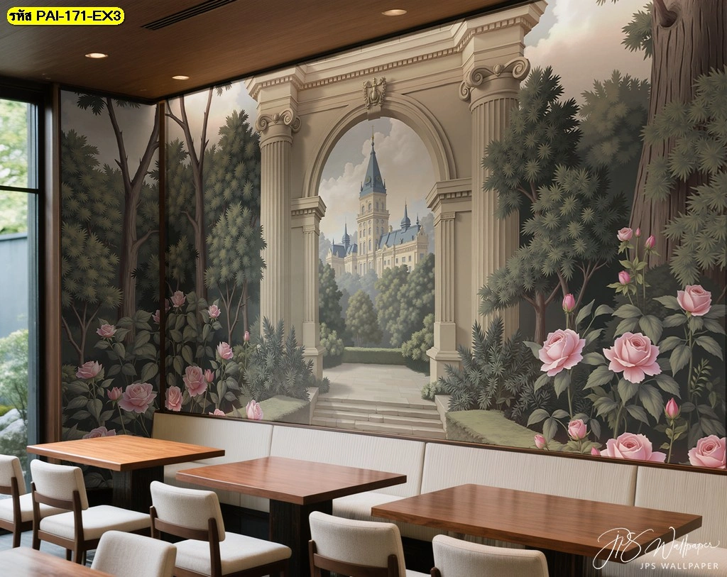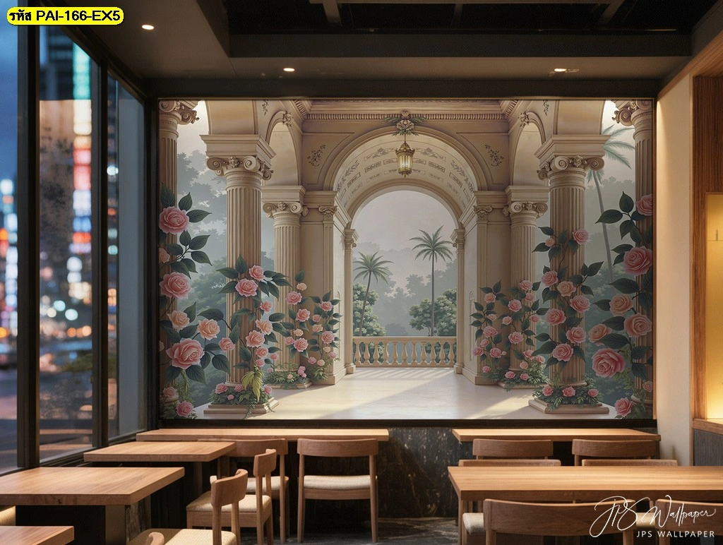 วอลเปเปอร์รูปซุ้มประตูสวนสไตล์โรมัน แต่งคาเฟ่หรูด้วยลายเสาและดอกกุหลาบ เหมาะกับพื้นที่ร้านในเมืองสมัยใหม่
