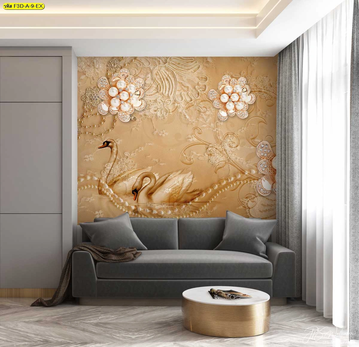 วอลเปเปอร์ฮวงจุ้ยหงส์คู่สีทองเล่นระดับ 3 มิติประดับดอกไม้และเพชรสวยงามช่วยเสริมความรักและความมั่งคั่งมั่งมีภายในห้องนั่งเล่นสุดหรู