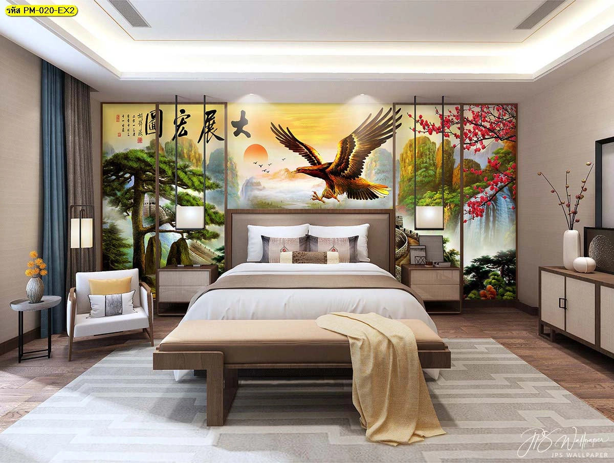 การติดตั้งวอลเปเปอร์ลายกำแพงเมืองจีนและนกอินทรีทองเสริมดวงการงานในห้องนอนเพื่อกระตุ้นพลังแห่งความสำเร็จและการปกป้องคุ้มครองจากสิ่งชั่วร้าย