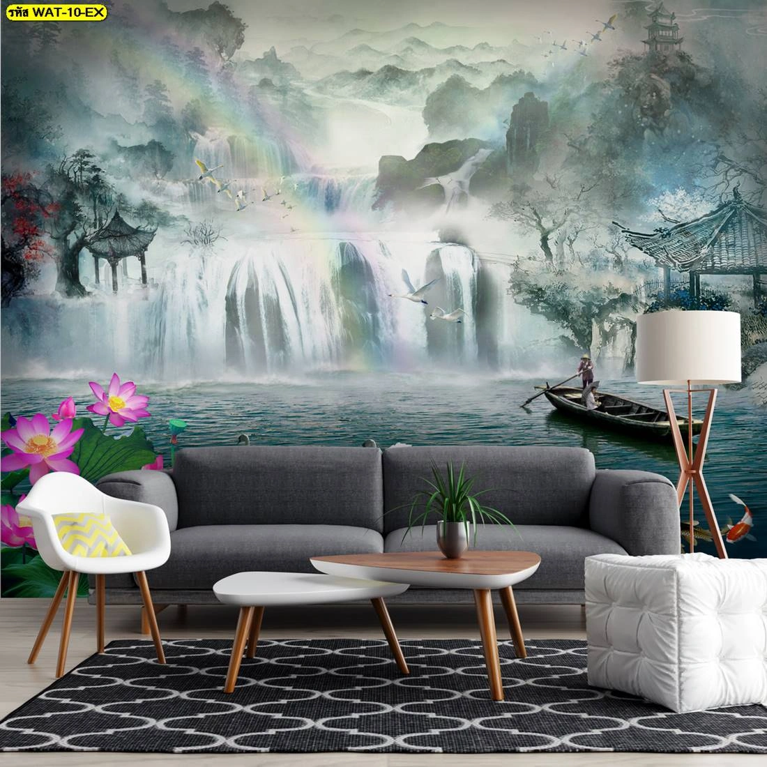 วอลเปเปอร์ฮวงจุ้ยน้ำตกภาพวาดพู่กันจีนผสมสายรุ้งมงคล ช่วยเสริมความมั่งคั่งและโชคลาภให้แก่เจ้าของบ้านอย่างยั่งยืน
