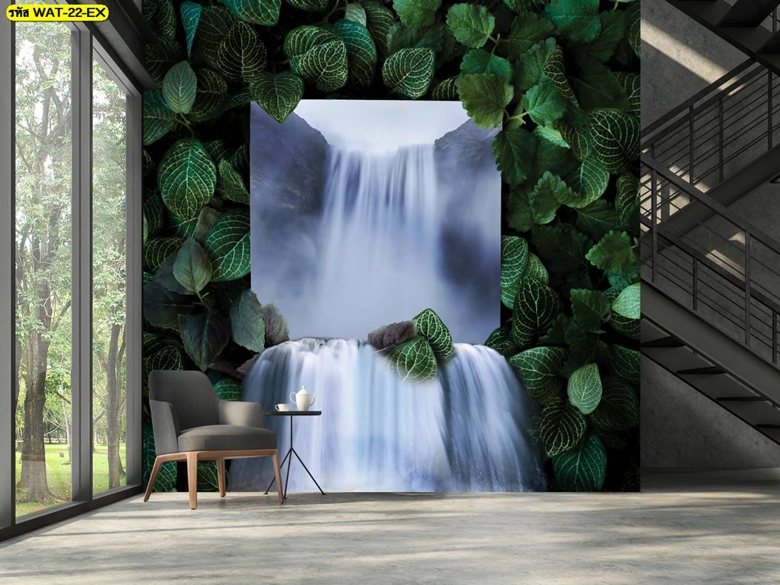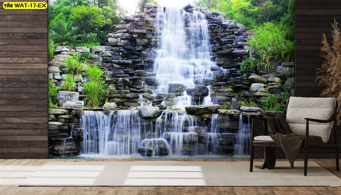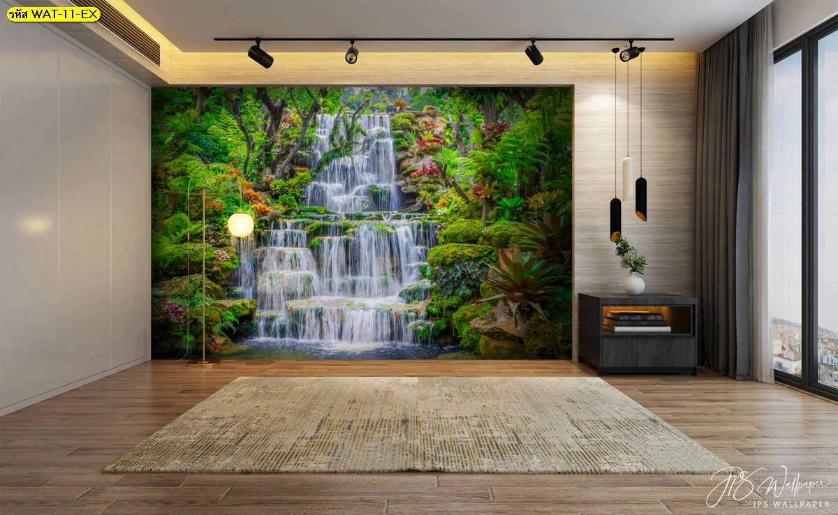 วอลเปเปอร์ภาพวิวน้ำตกขนาดใหญ่ติดผนังหินกาบดีไซน์ธรรมชาติสมจริง ช่วยสร้างบรรยากาศผ่อนคลายและร่มเย็นภายในห้องรับแขก