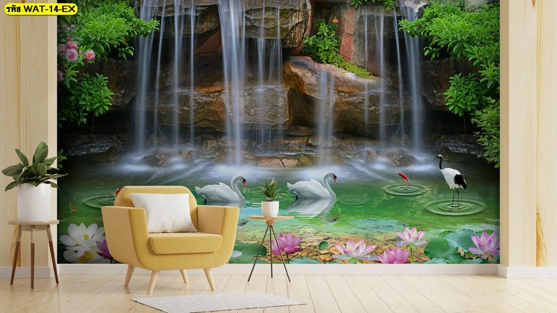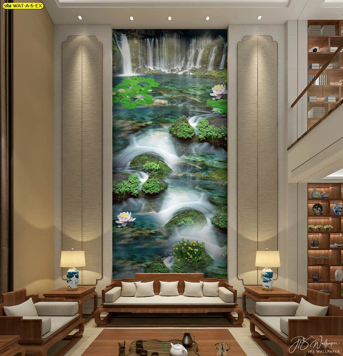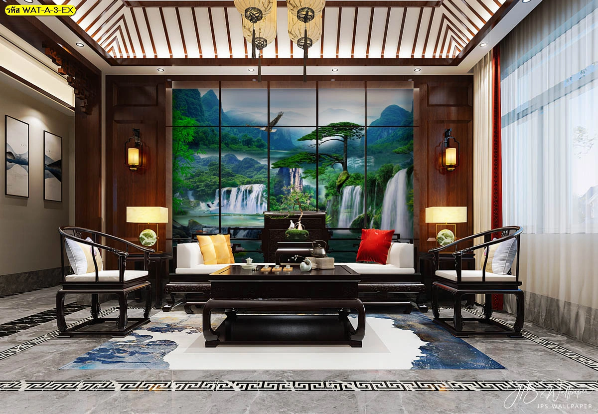 สำหรับบ้านที่เน้นความร่วมสมัย วอลเปเปอร์น้ำตกงานศิลปะสไตล์จีนโมเดิร์น คือคำตอบที่ลงตัวที่สุด Features คือการผสมผสานลายเส้นพู่กันจีนดั้งเดิมเข้ากับโทนสีที่ทันสมัย Advantages ของงานสไตล์นี้คือความเรียบง่ายแต่แฝงไปด้วยความหมายมงคล เช่น นกกระเรียนหรือดอกบัวที่ปรากฏในภาพ Benefits คือการสะท้อนรสนิยมอันวิไลของเจ้าของบ้าน พร้อมทั้งส่งเสริมความสัมพันธ์อันดีของคนในครอบครัวผ่านบรรยากาศที่สงบและร่มเย็น