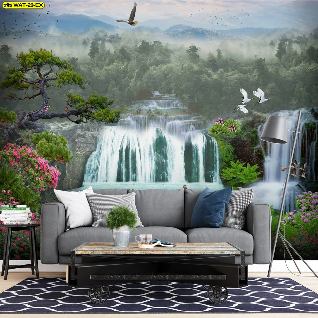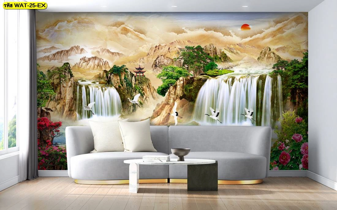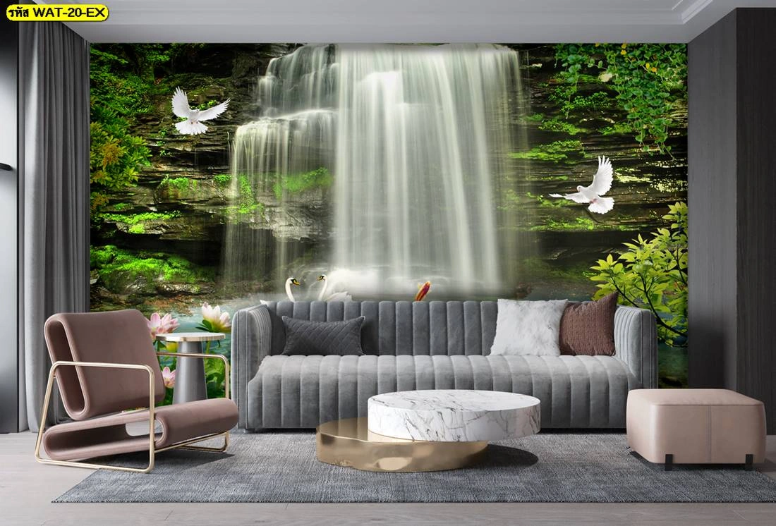 วอลเปเปอร์น้ำตกเสริมดวงห้องรับแขก ภาพวิวทิวเขาและนกมงคล ช่วยส่งเสริมความมั่นคงในหน้าที่การงานและยกระดับความหรูหราให้แก่สถาปัตยกรรมภายในบ้าน