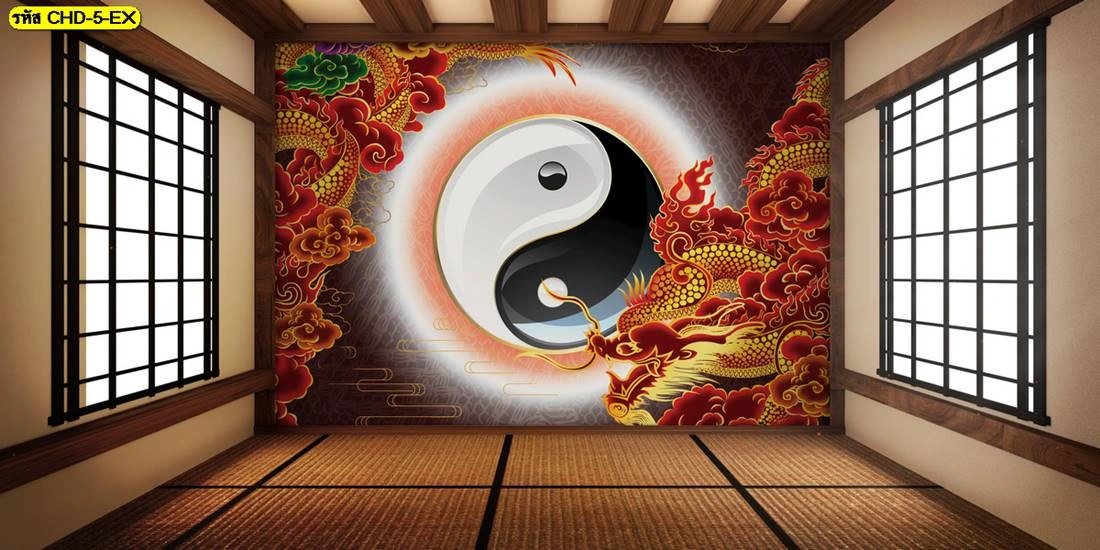ภาพพิมพ์วอลเปเปอร์ลายมังกรทองและสัญลักษณ์หยินหยางสร้างความสมดุลของพลังงานภายในบ้านเพื่อความสงบสุขของผู้อยู่อาศัย