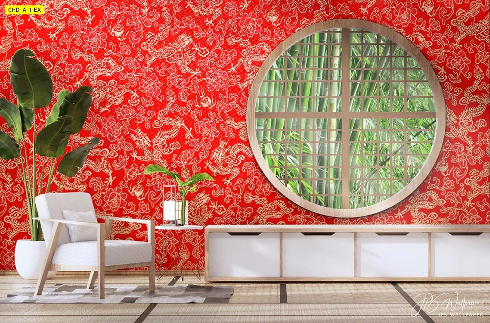 รับพิมพ์วอลเปเปอร์ติดผนังลายจีนทองลายเส้นละเอียดสีแดงทองประดับหน้าต่างวงกลมสร้างบรรยากาศห้องรับแขกให้ดูทันสมัยสไตล์เอเชีย