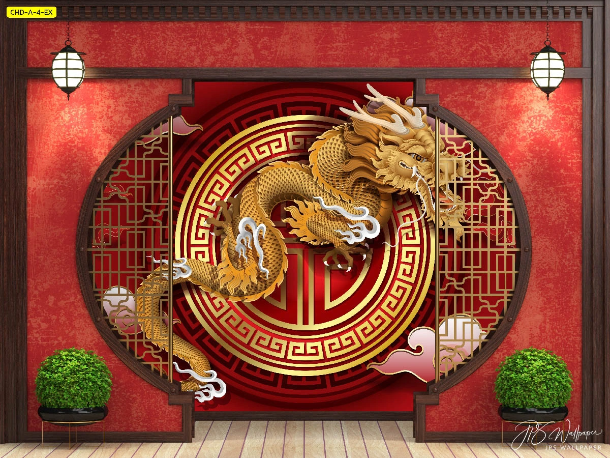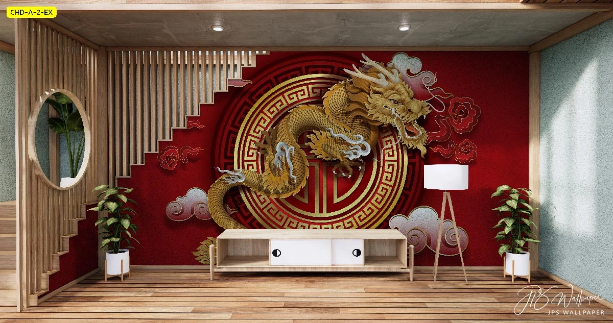 ตกแต่งห้องสไตล์จีนด้วยวอลเปเปอร์ลายมังกรทองขนาดใหญ่ในวงกลมมงคลสร้างบรรยากาศที่เปี่ยมไปด้วยพลังและขจัดสิ่งชั่วร้าย