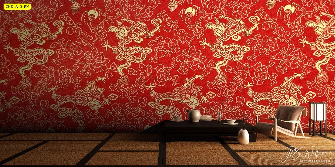 รับพิมพ์วอลเปเปอร์ติดผนังลายจีนทองรูปมังกรทะยานฟ้าท่ามกลางหมู่เมฆมงคลพื้นหลังสีแดงแรงฤทธิ์เสริมโชคลาภและความรุ่งเรือง