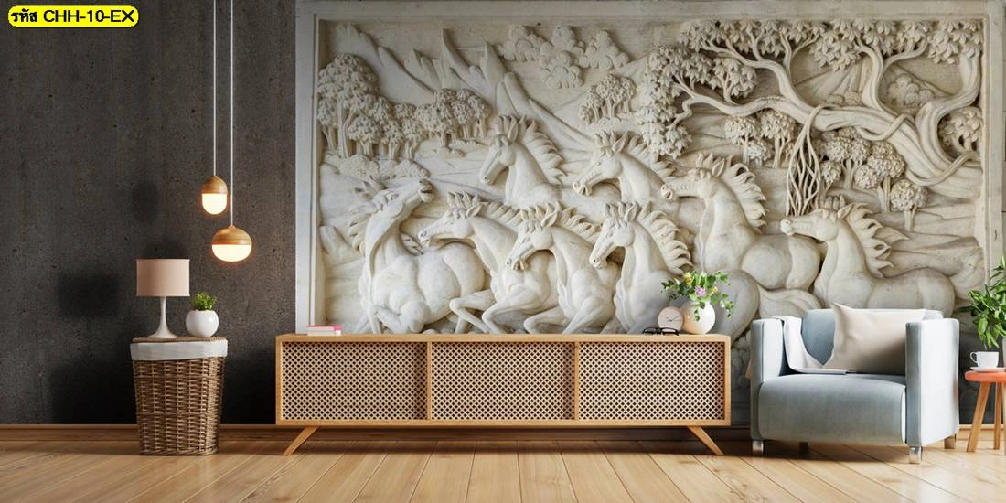 นอกจากงานวาดแบบศิลปะแล้ว เรายังมีวอลเปเปอร์ลายปูนปั้นนูนต่ำที่ให้ Texture ทางสายตาเหมือนงานแกะสลักหินจริง สร้างความรู้สึกหนักแน่น มั่นคง แต่ยังคงความอ่อนช้อยของสรีระม้าไว้อย่างงดงาม เหมาะสำหรับตกแต่งผนังหลังทีวี หรือโถงทางเดิน เพื่อสร้างความประทับใจแรกเห็นให้กับแขกผู้มาเยือน