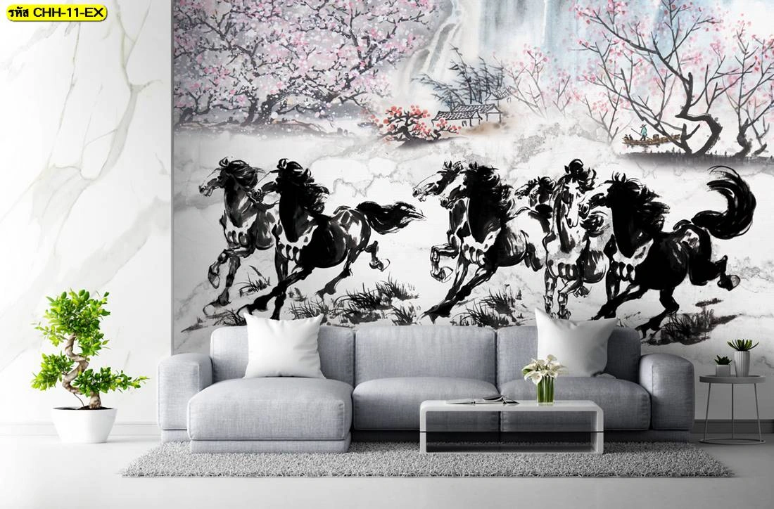 วอลเปเปอร์ลายม้าแปดตัววิ่งสไตล์ภาพวาดพู่กันจีนพื้นหลังลายหินอ่อนและต้นซากุระให้ความรู้สึกสงบร่มเย็นผสมผสานความเป็นเอเชียได้อย่างลงตัว