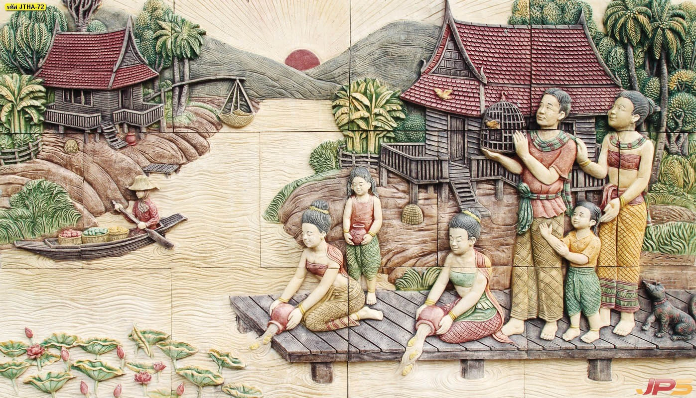 วอลเปเปอร์ลายไทยแกะสลักนูนต่ำภาพวิถีชีวิตชาวบ้านริมน้ำและครอบครัวไทยดั้งเดิมสร้างบรรยากาศอบอุ่นร่มเย็นให้ภายในบ้าน
