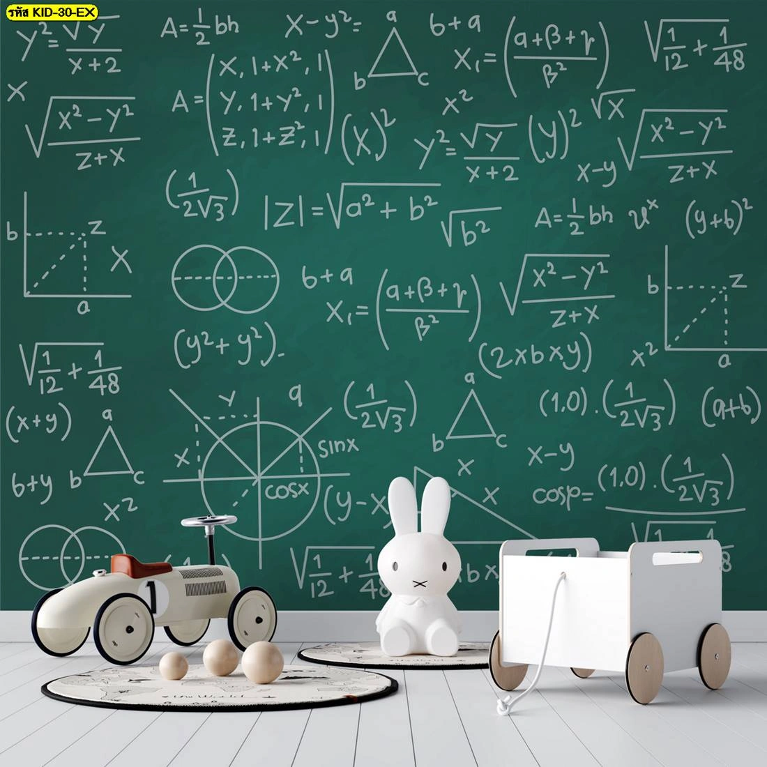 วอลเปเปอร์ลายกระดานสูตรคณิตศาสตร์สีเขียวพร้อมสูตรและสัญลักษณ์ทางคณิตศาสตร์เขียนด้วยชอล์กสีขาวเป็นทางเลือกที่น่าสนใจสำหรับครูอนุบาลที่ต้องการสร้างห้องเรียนแบบ educational theme ที่เน้นการเรียนรู้เชิงวิชาการ องค์ประกอบของภาพประกอบด้วยสมการพีชคณิต เรขาคณิต ตรีโกณมิติ และตัวเลขต่างๆ ที่จะช่วยให้เด็กปฐมวัยคุ้นเคยกับตัวเลขและสัญลักษณ์ตั้งแต่เยาว์วัย ภาพติดผนังดีไซน์นี้เหมาะสำหรับโรงเรียนเอกชนที่ต้องการจัดห้องเรียนพิเศษสำหรับกิจกรรมคณิตศาสตร์หรือพื้นที่ learning corner ที่ส่งเสริมทักษะการคิดวิเคราะห์ โทนสีเขียวกระดานช่วยสร้างบรรยากาศห้องเรียนแบบคลาสสิกที่เด็กเล็กรู้จักและรู้สึกคุ้นเคย พร้อมกระตุ้นความอยากรู้อยากเห็นในวิชาคณิตศาสตร์