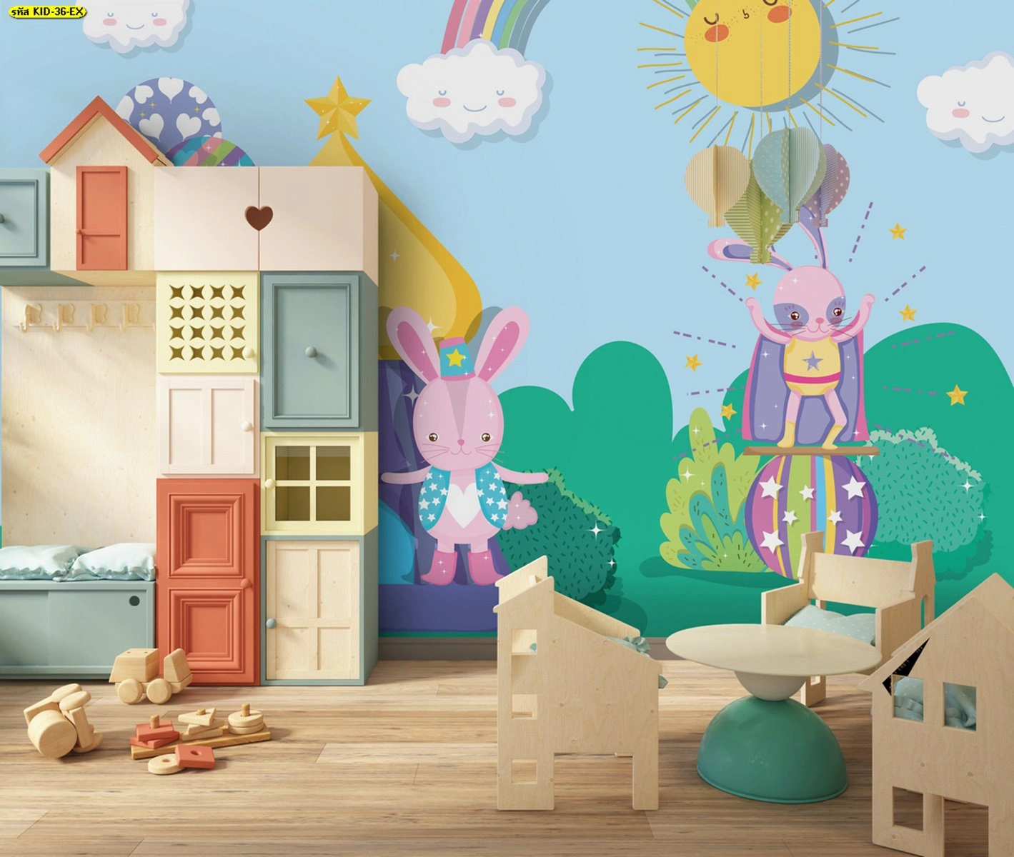 ตกแต่งห้องเรียนอนุบาลด้วยภาพเทพนิทานกระต่ายและฉากธรรมชาติสีสันสดใส