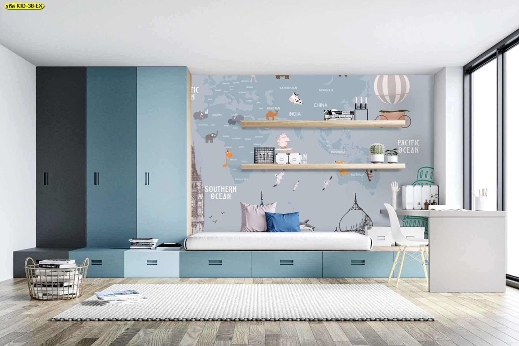 วอลเปเปอร์สั่งพิมพ์ห้องเรียนเด็กลายแผนที่โลกสัตว์น่ารักสไตล์การ์ตูนโทนสีฟ้าเทาพร้อมชั้นวางไม้ตกแต่งห้องนอนเด็กสมัยใหม่มินิมอลโมเดิร์นเหมาะสำหรับครูอนุบาลโรงเรียนเอกชนเสริมพัฒนาการเด็กปฐมวัยเรียนรู้ภูมิศาสตร์ทวีปประเทศสัตว์แต่ละแหล่ง