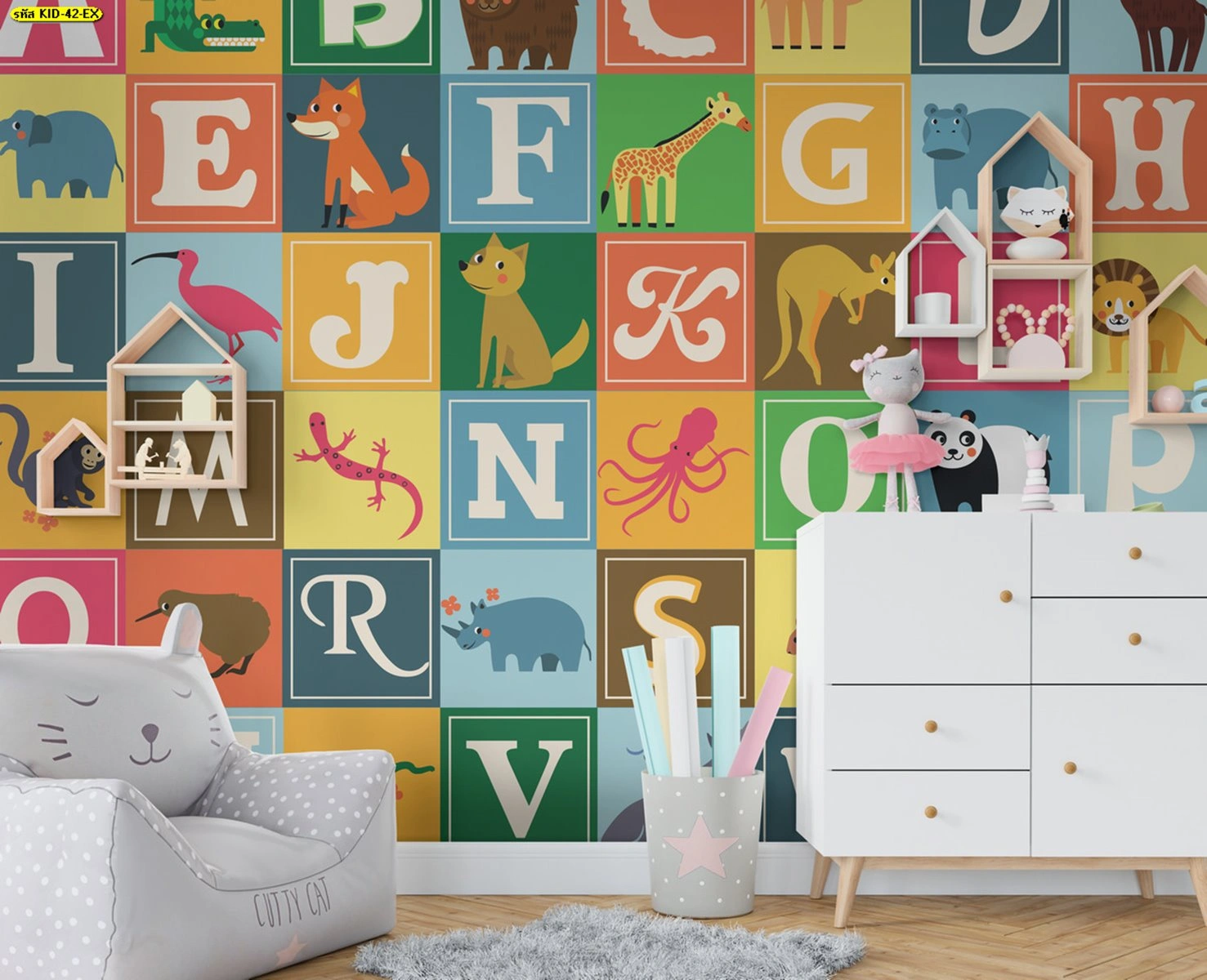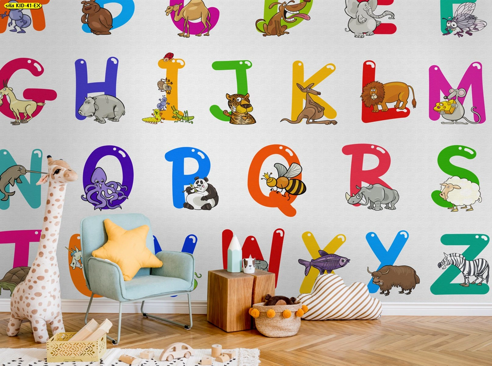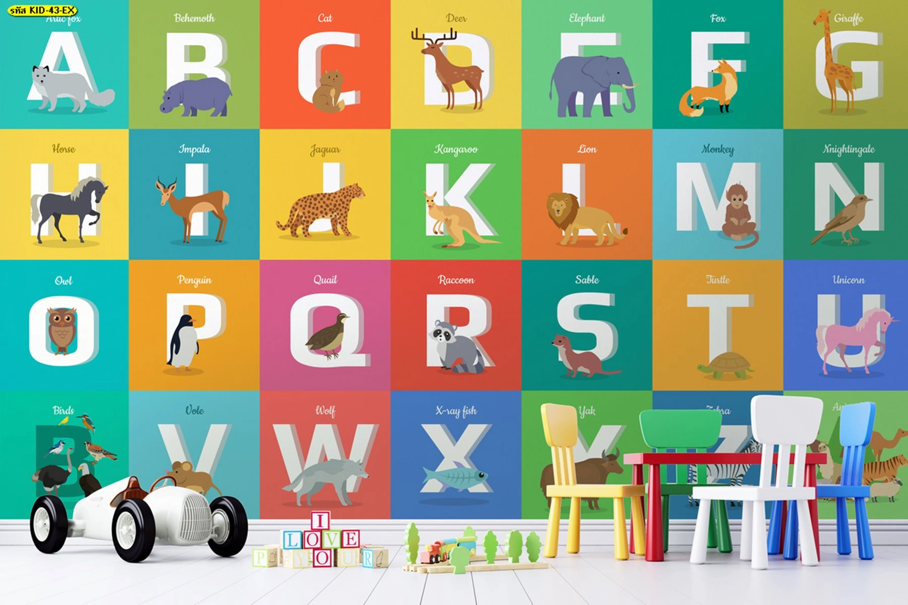 ภาพติดผนังห้องเรียนอนุบาลลายตัวอักษรภาษาอังกฤษ สีสันสดใสพร้อมภาพประกอบสัตว์น่ารักแต่ละตัวอักษรสไตล์การ์ตูน3มิติ